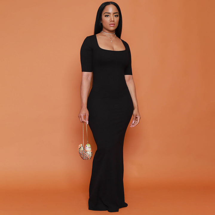 TD2307 Independent Station Source U-neck short-sleeved slim-fit solid-color threaded long dress