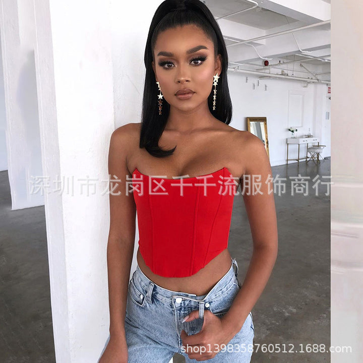 There are light satin curved chest wrapping women, European and American playful and sexy wind backless navel one-word collar slim top, in stock