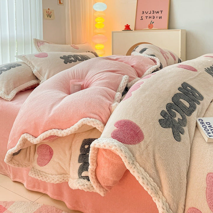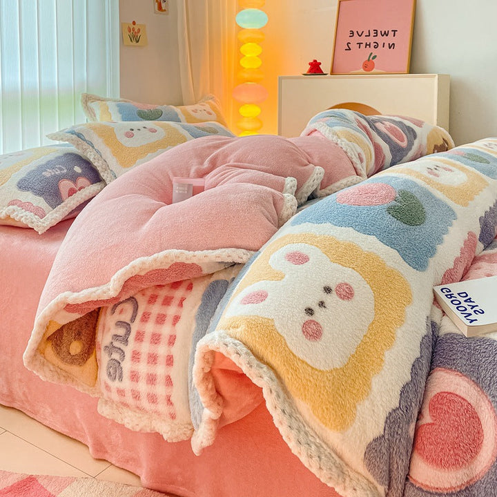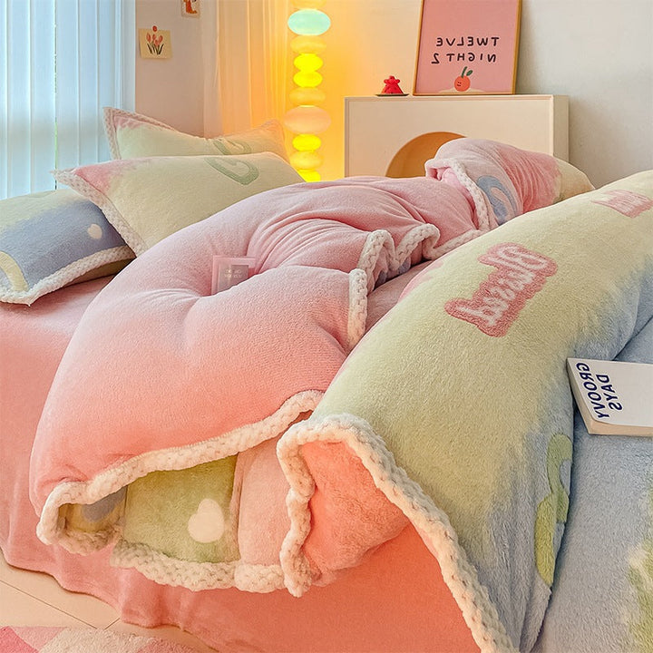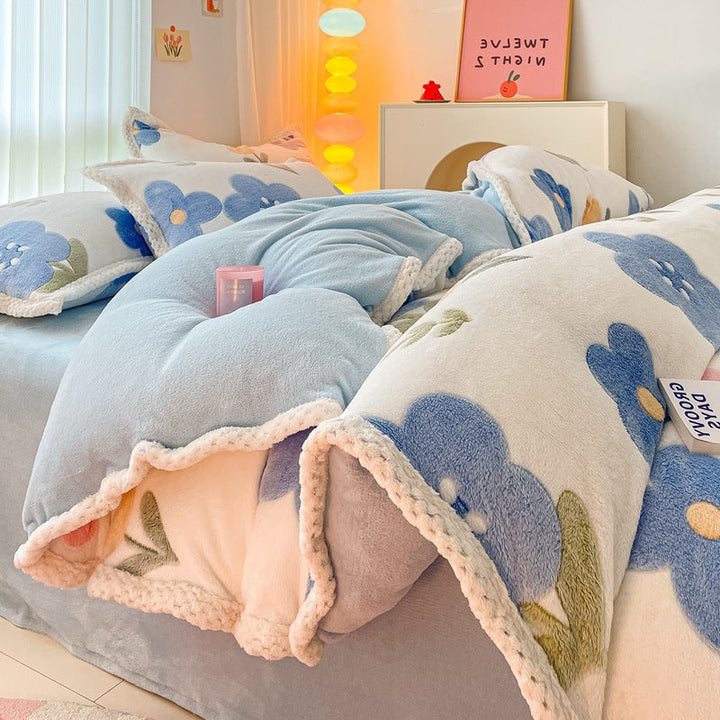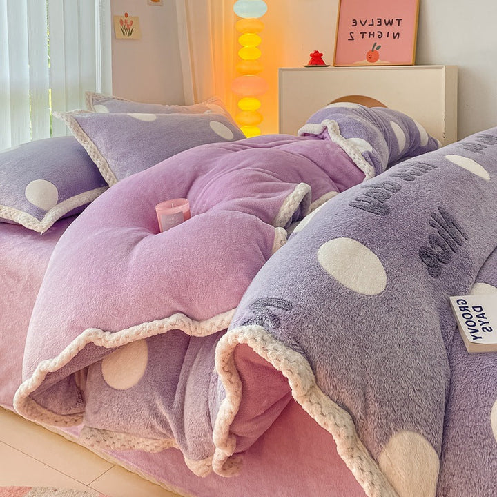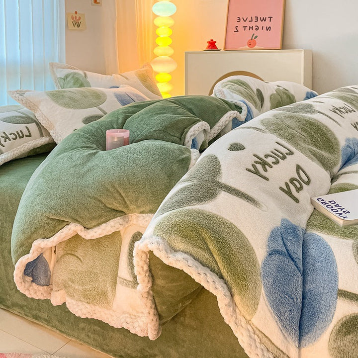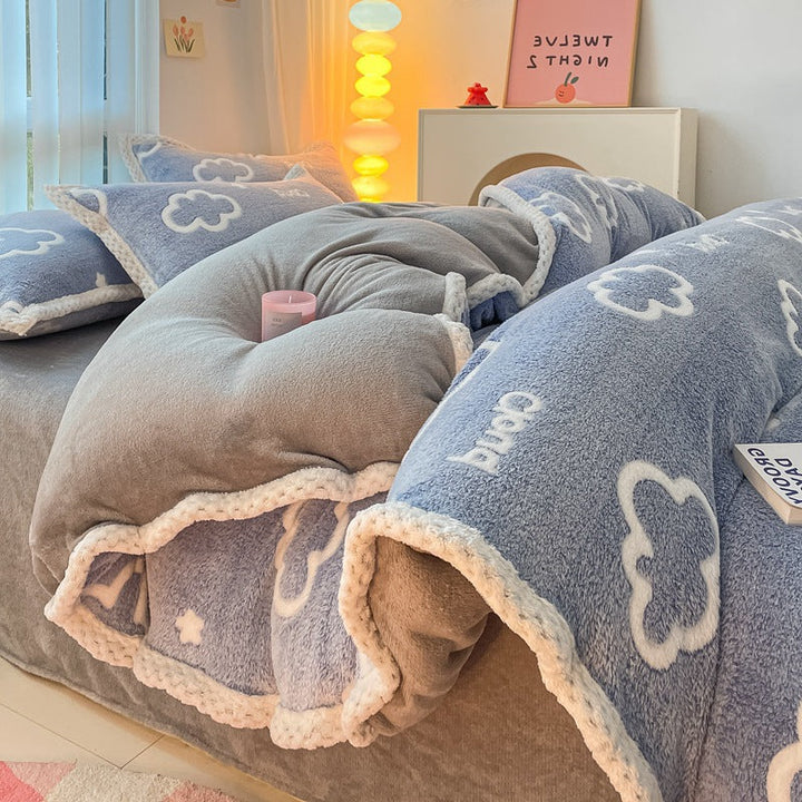 Thickened coral fleece bed sheet four-piece set wholesale wide-sided milk fleece quilt cover ...