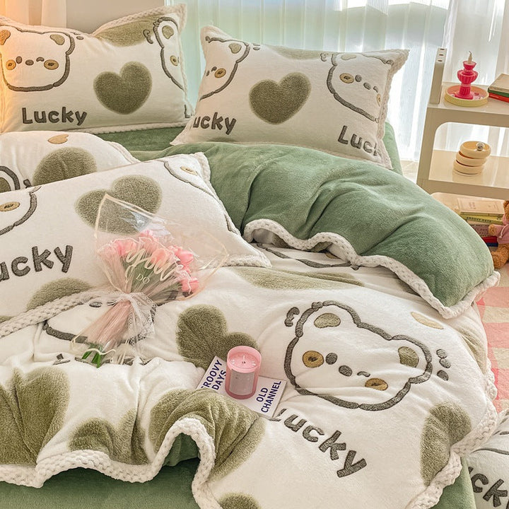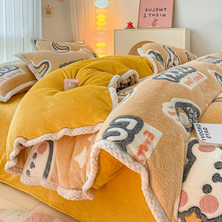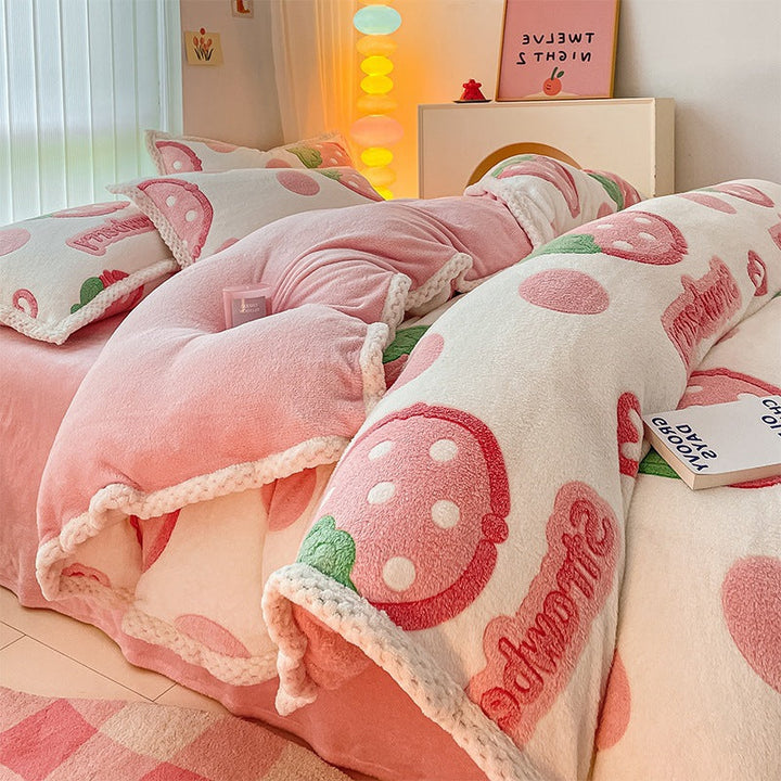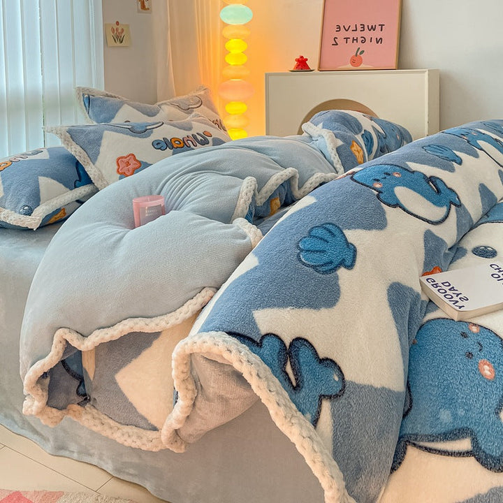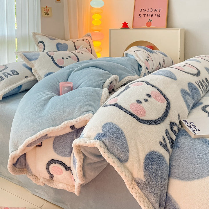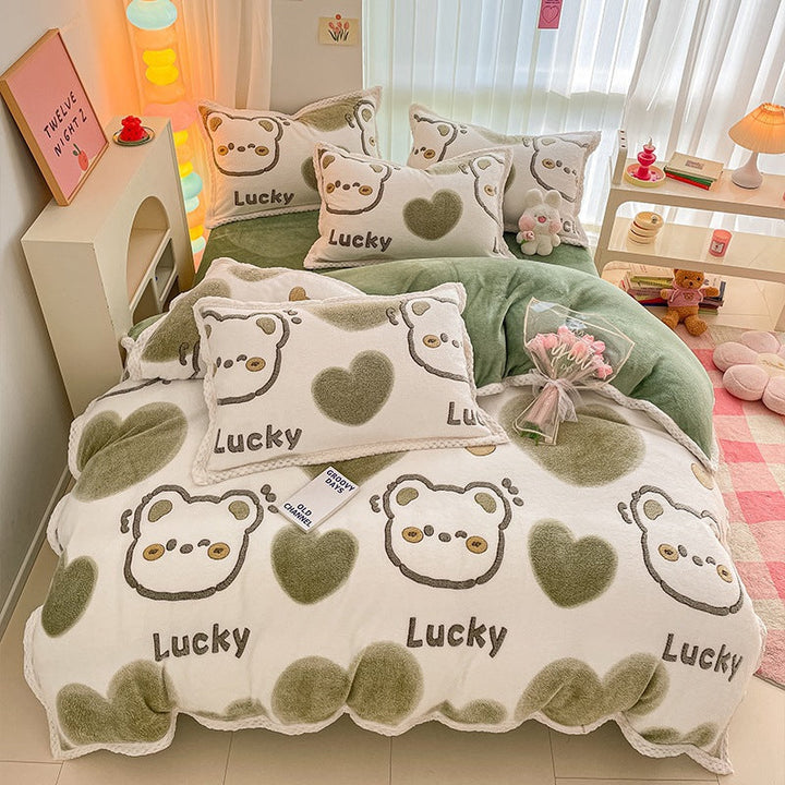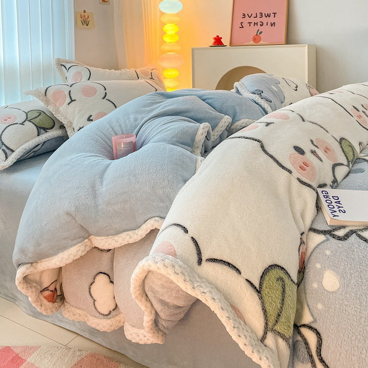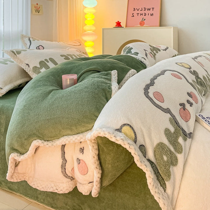 Thickened coral fleece bed sheet four-piece set wholesale wide-sided milk fleece quilt cover ...