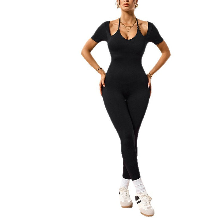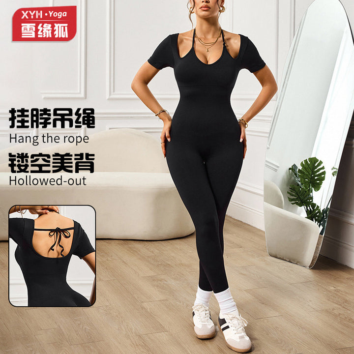 Threaded Seamless Sports Yoga onesie Women's Suspender Neck Strap Back Short Sleeve Peach Hip Jumpsuit Trousers