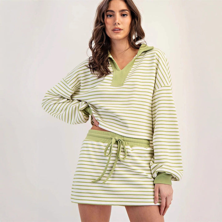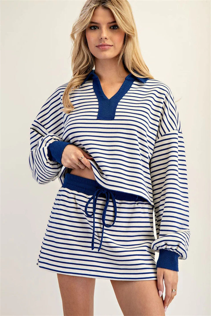 TK Independent Station European and American women's clothing long-sleeved V-neck striped top high-waisted shorts casual two-piece set