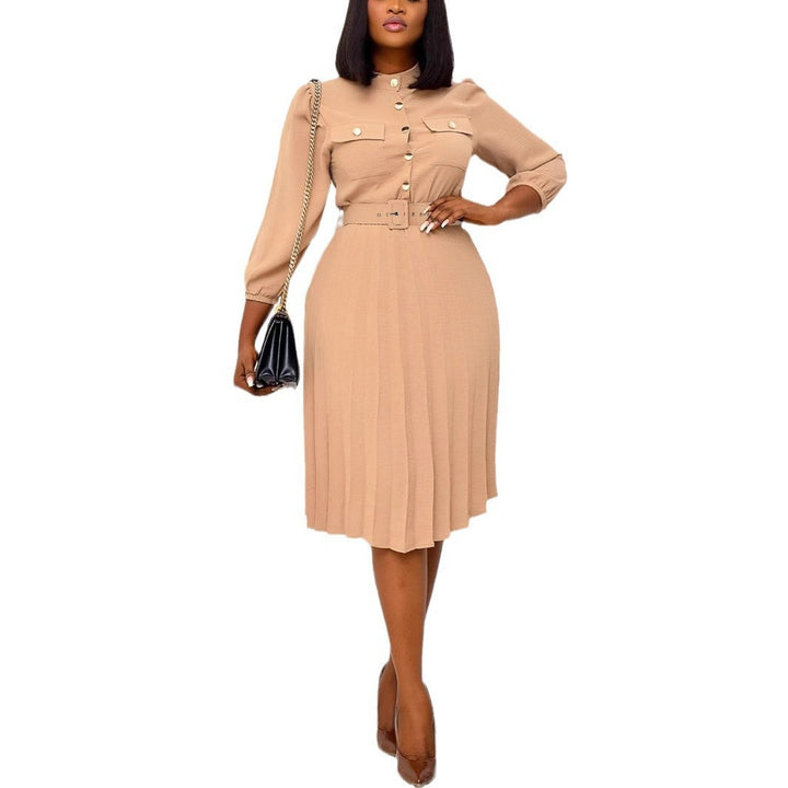 TM085 Independent Station European and American Foreign Trade Spring and Autumn Women's Clothing Solid Color Casual Loose Pleated Belt Dress