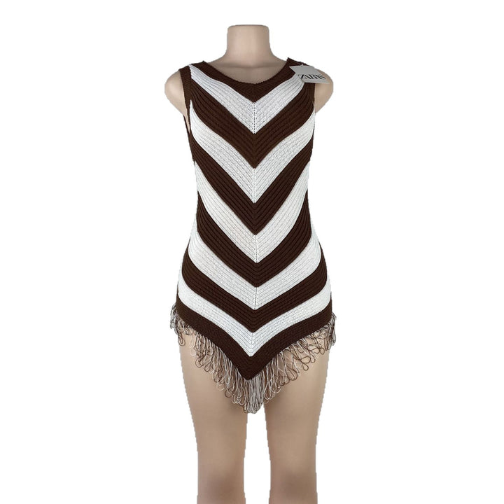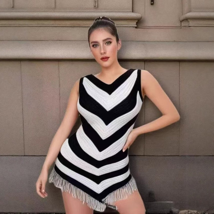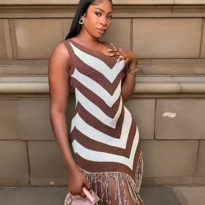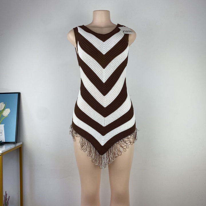 Travel and vacation wear women's clothing skirt summer color matching rhombus pattern slim and thin irregular fringed dress