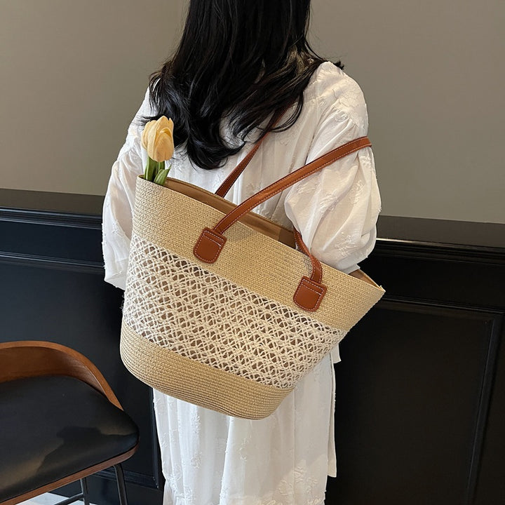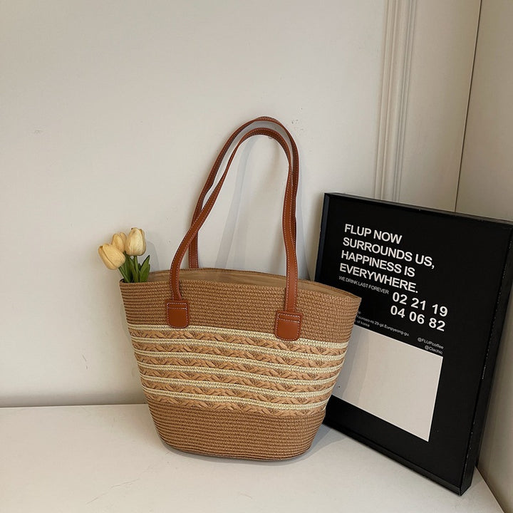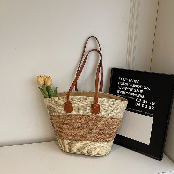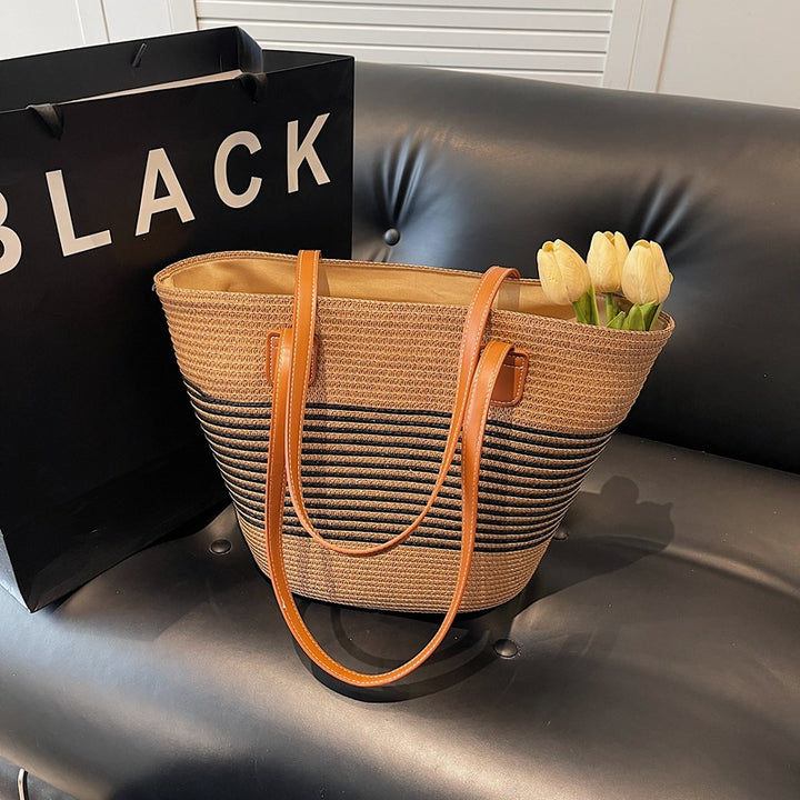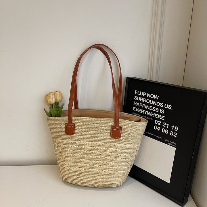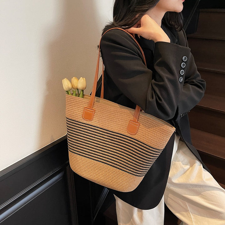 Trend popular shoulder underarm straw bag women's large capacity casual woven tote bag seasid...