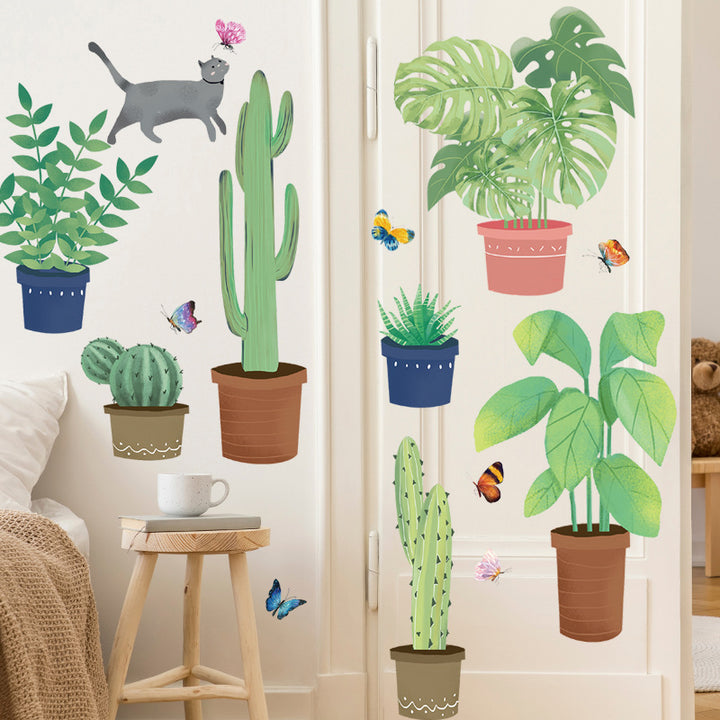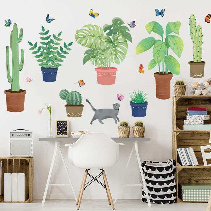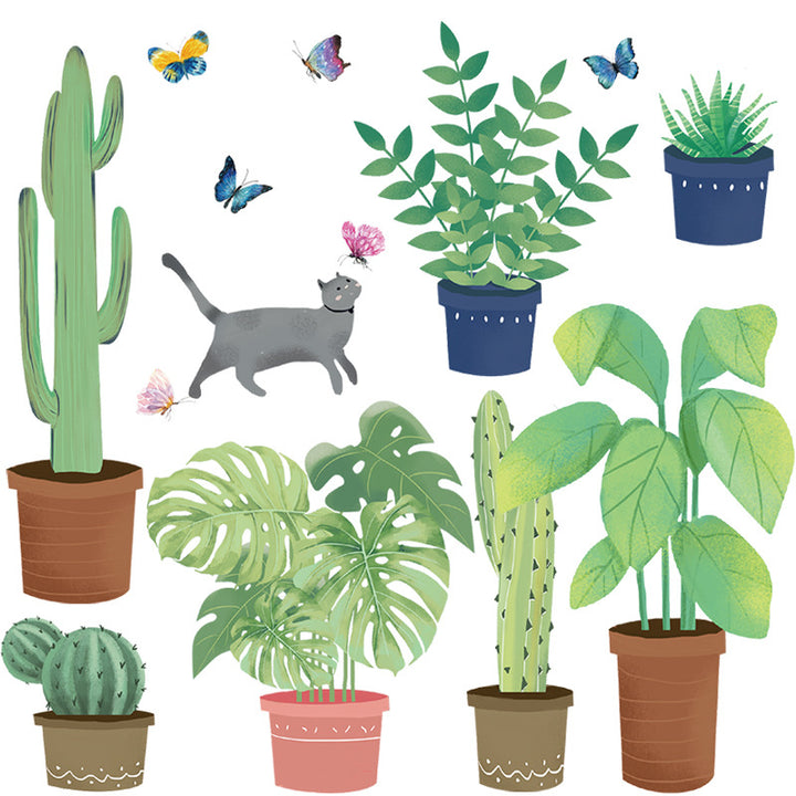 Tropical plants, green leaves, potted plants, cats, fresh literary self-adhesive glass stickers, decorative wall stickers XL7248