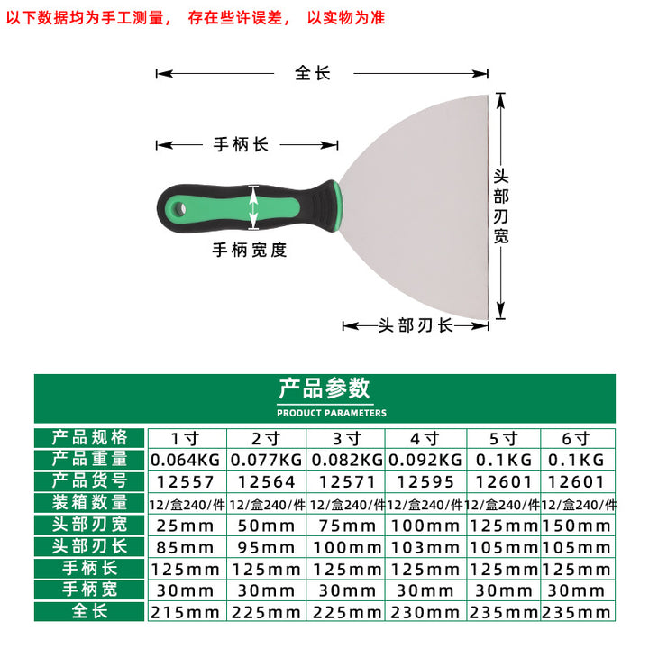 12557,1寸油灰刀,12/盒240/件,0.064KG, 12564,2寸油灰刀,12/盒,240/件,0.077KG, 12571,3寸油灰刀,12/盒,240/件,0.082KG, 12588,4寸油灰刀,12/盒,240/件,0.092KG, 12595,5寸油灰刀,12/盒,240/件,0.096KG, 12601,6寸油灰刀,12/盒,240/件,0.1kg |