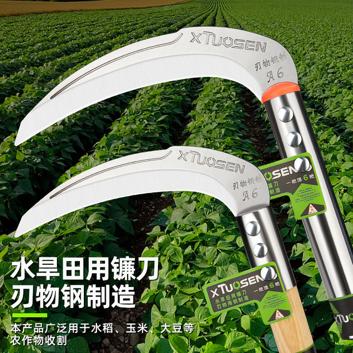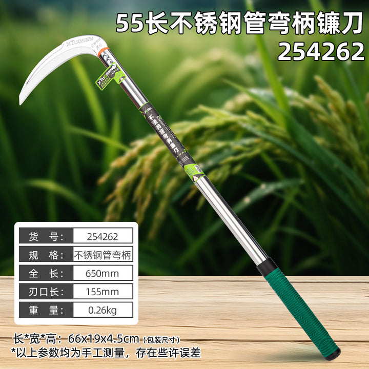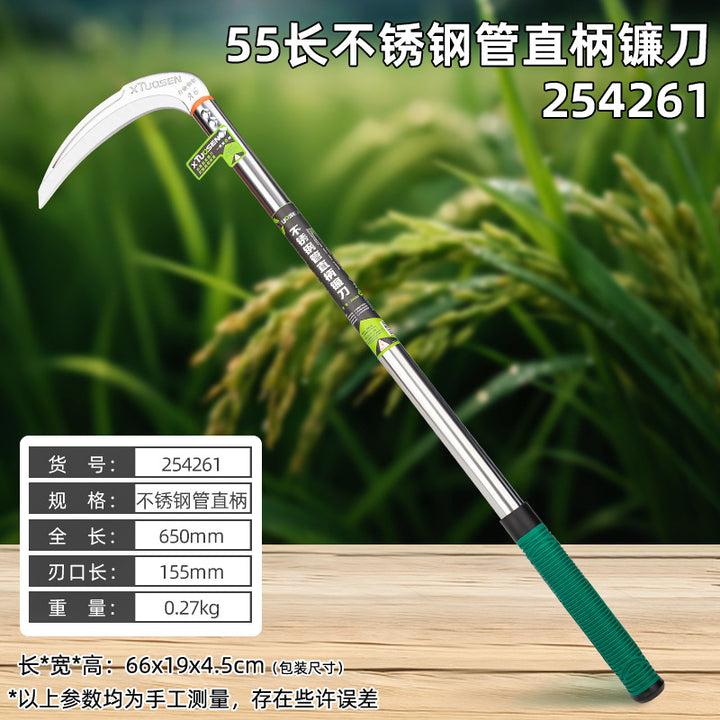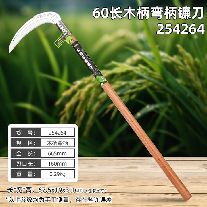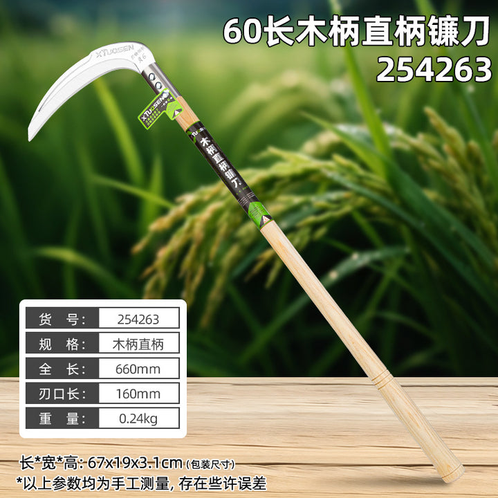 254261, 55 long stainless steel straight-shank scythe lawn mower, 30-60, 0.27kg, 254262, 55 long stainless steel curved handle old-fashioned agricultural sickle, 30-60, 0.26kg, 254263, 60 extended rod wooden handle straight handle lawn mower, 30-60, 0.24kg, 254264, 60 Extended Rod Wooden Handle Bending Handle Cutting Rice Sickle, 30-60, 0.29kg |