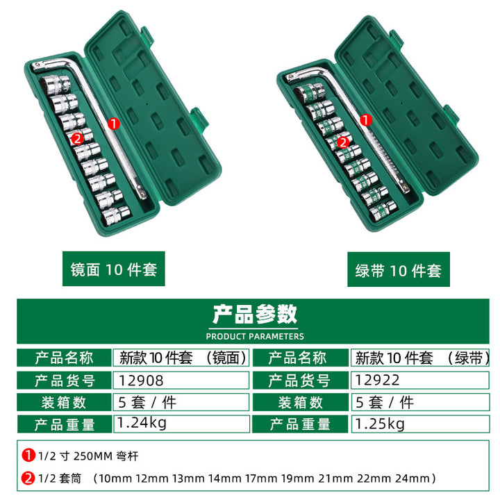 12908, new mirror 10-piece sleeve wrench, 20 boxes/piece, 1.24kg, 12922, new green belt 10-piece socket wrench, 20 boxes/piece, 1.25kg |