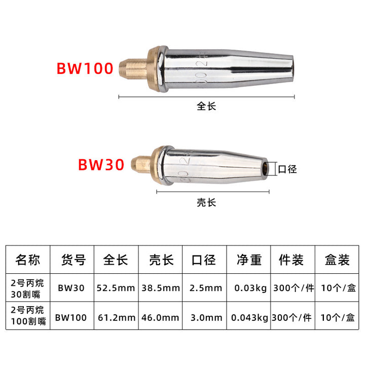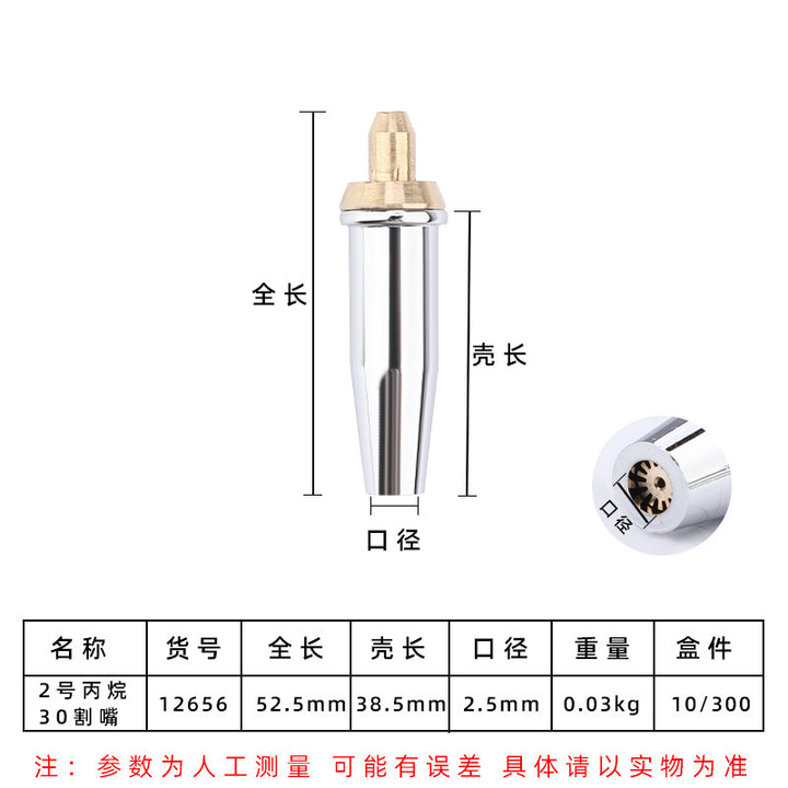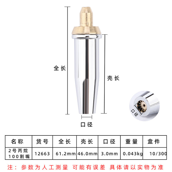 12656, No. 2 propane 30 cutting nozzle, without opening the box, a box of 10, and a box weighs 0.03kg., 12663, No. 2 propane 100 cutting nozzle, without opening the box, a box of 10, and a box weighs 0.043kg. |