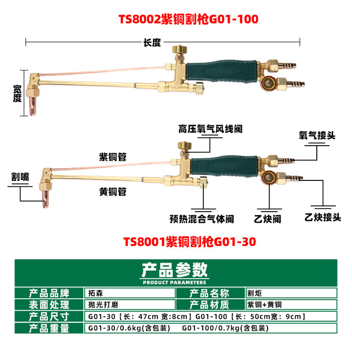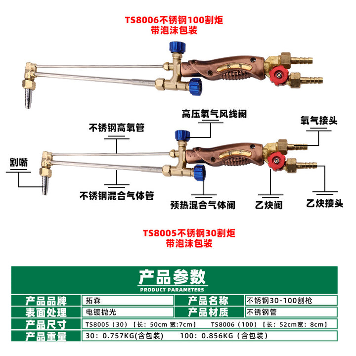 100567, copper cutting torch G01-30, 15 foam boxes per piece 0.6KG., 100568, copper cutting torch G01-100, 15 foam boxes per piece 0.7KG., 100569, stainless steel 30 torch, 15 pcs/piece 0.76kg, 100570, stainless steel 100 torch, 15 pieces/piece 0.86kg |