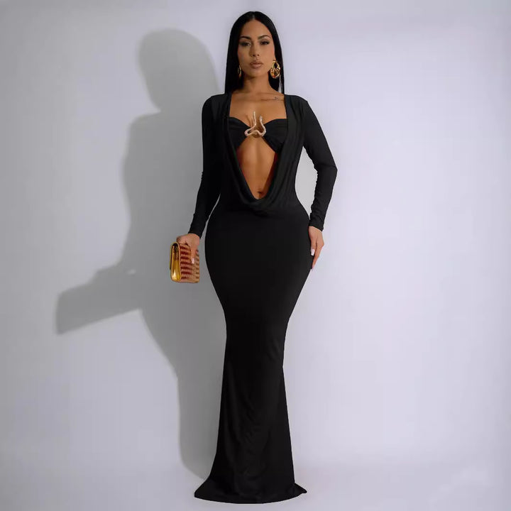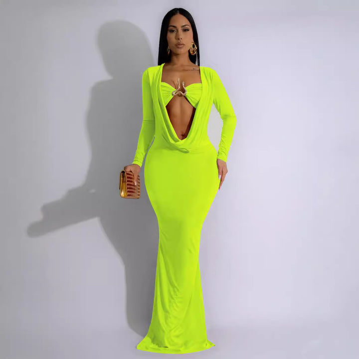 TW570 European and American ins style temperament dress deep V neckline pendant pleated long sleeve sexy hip dress