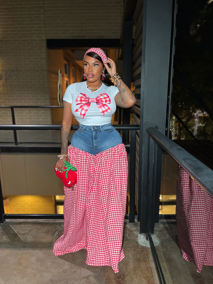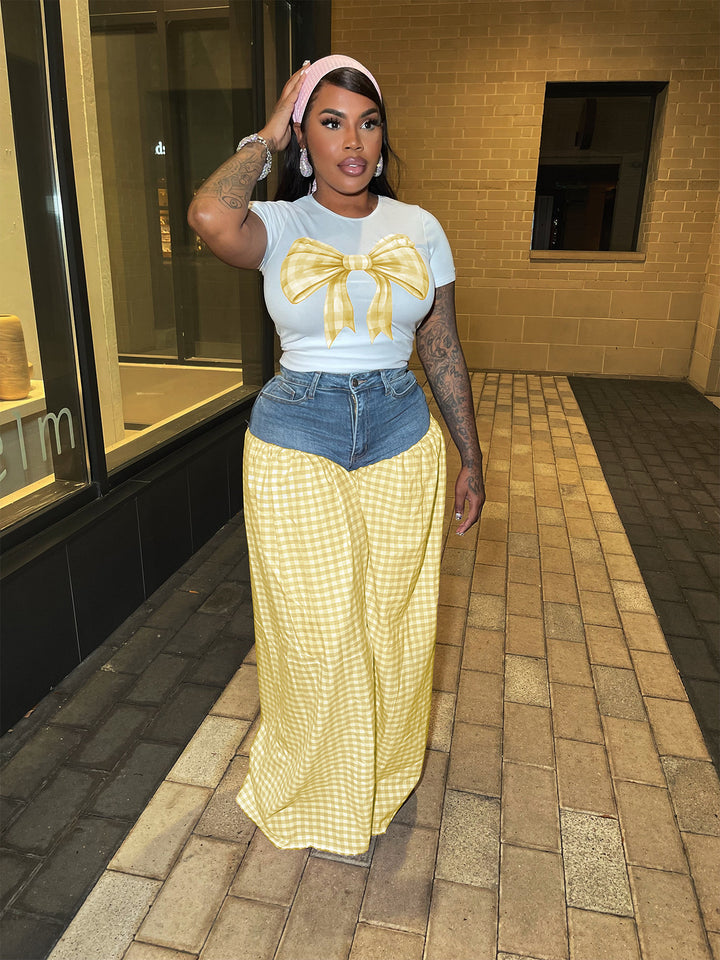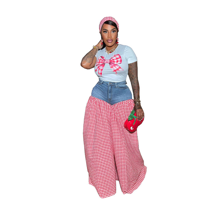 TW717 European and American women's clothing printed slim-fit T-shirt splicing plaid high-waisted loose casual wide-leg pants two-piece set