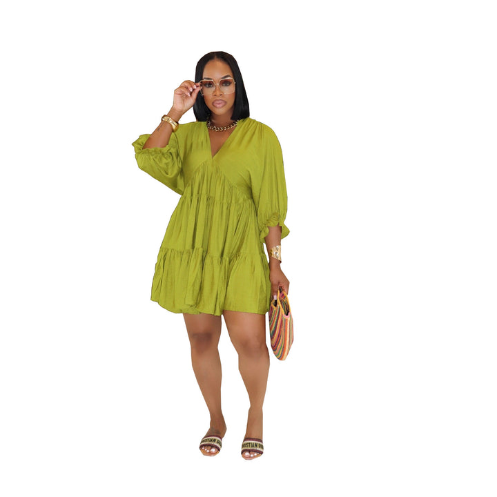 TW748 European and American fashion women's clothing solid color casual V-neck loose waist seven-quarter sleeve big pendulum pleated dress short