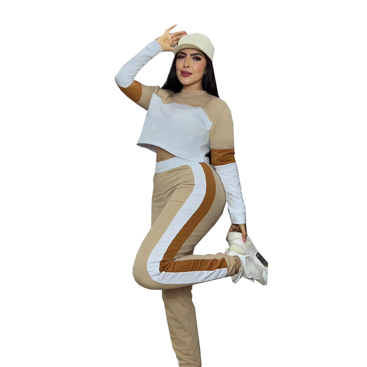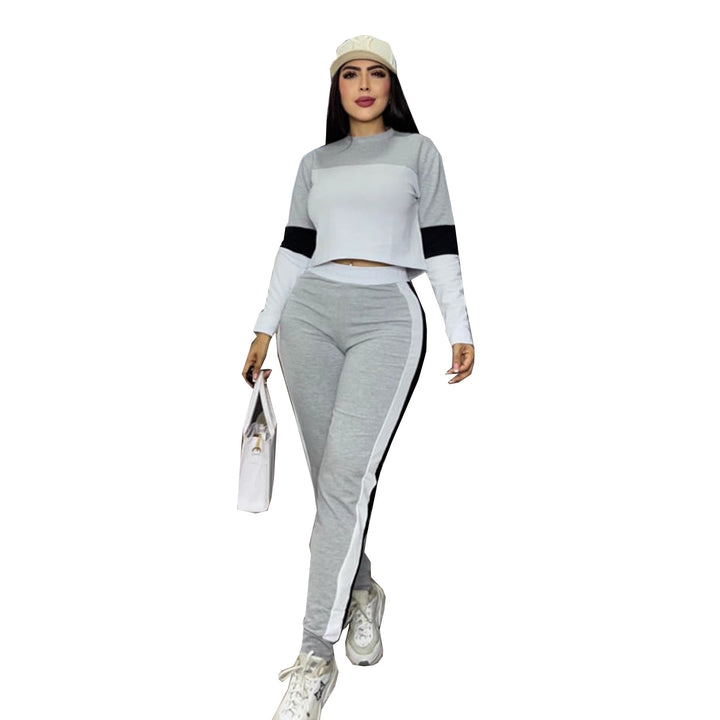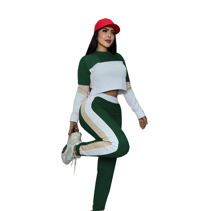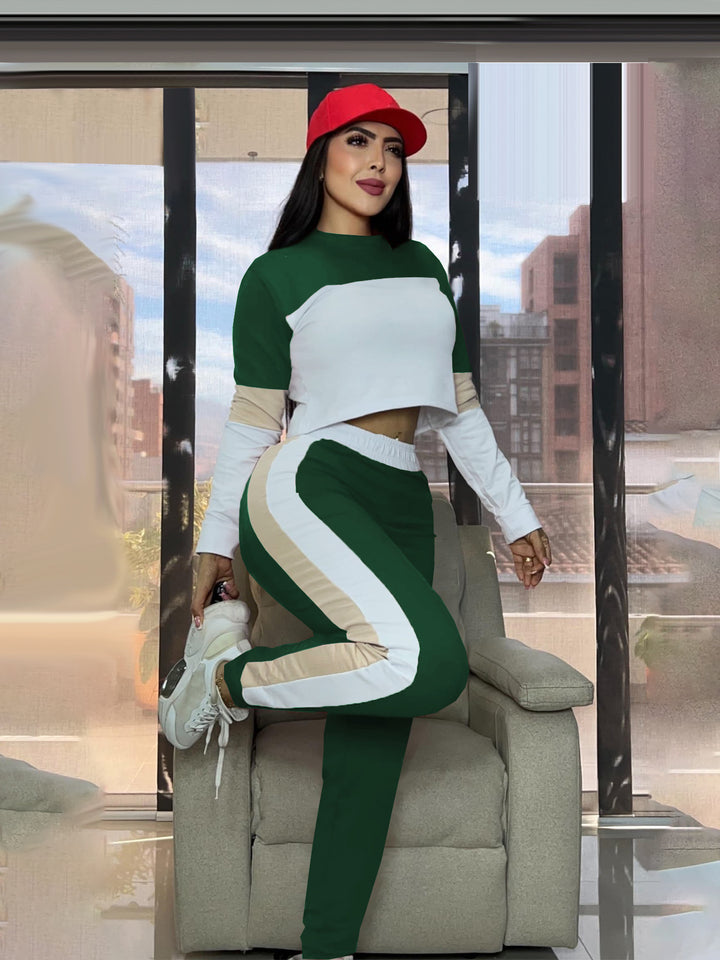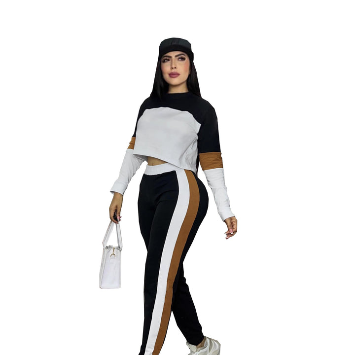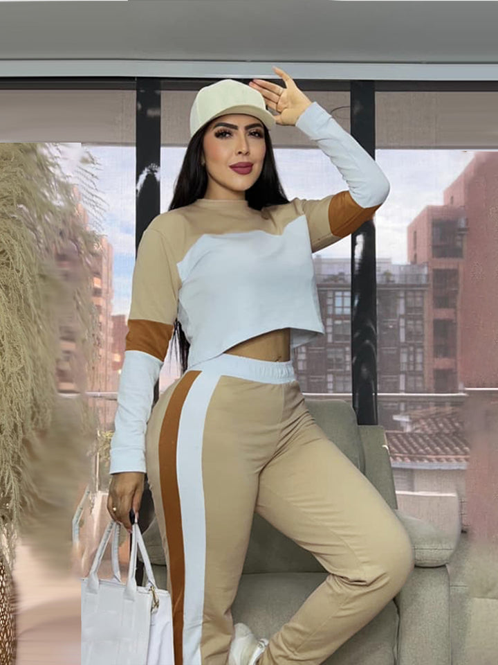 TW776 European and American fashion street color contrast splicing long-sleeved jumper women's sports and leisure trousers two-piece set