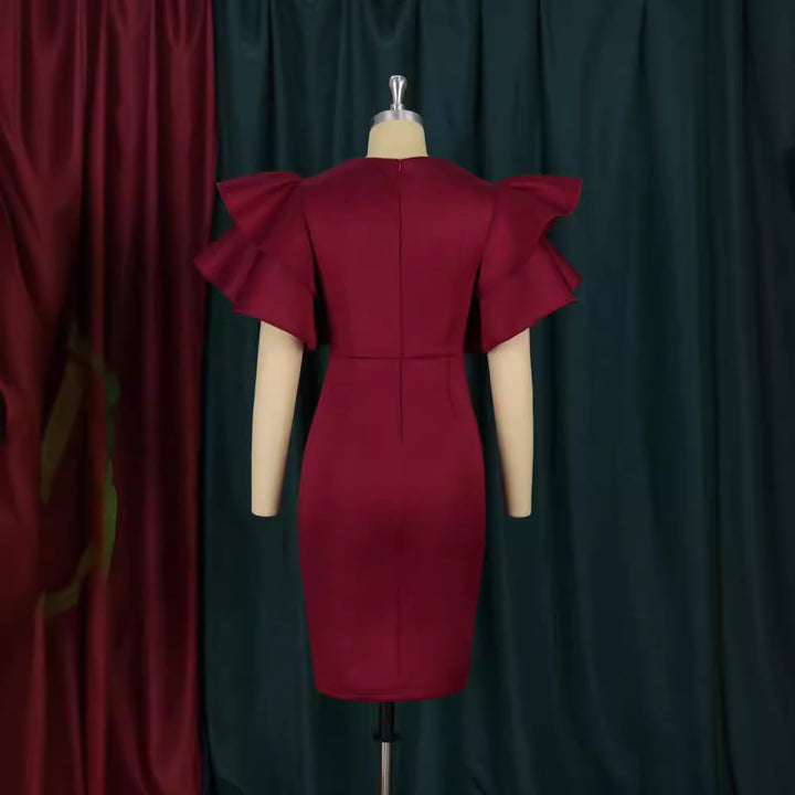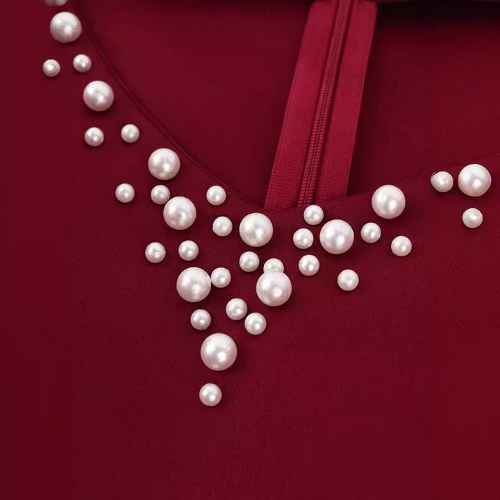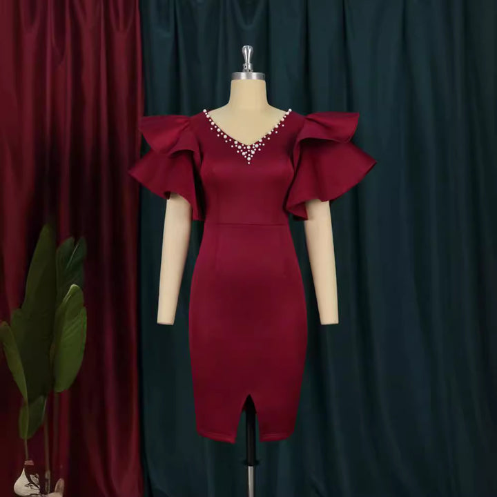 V-neck lotus leaf sleeve slit splicing beads S-XXXL large size women's clothing, dress party ...