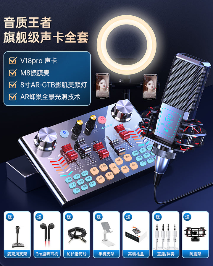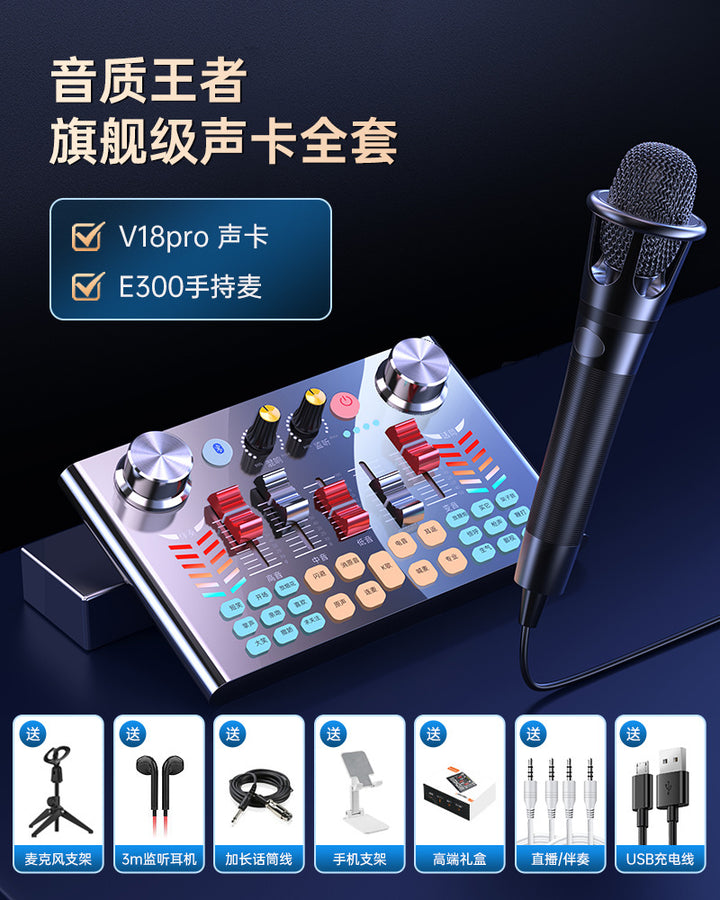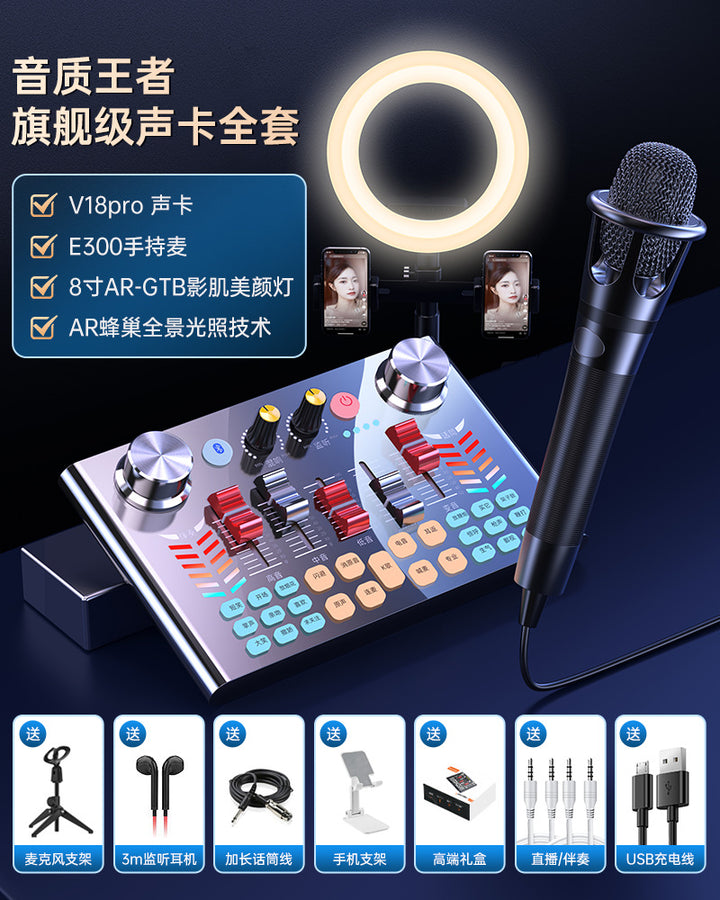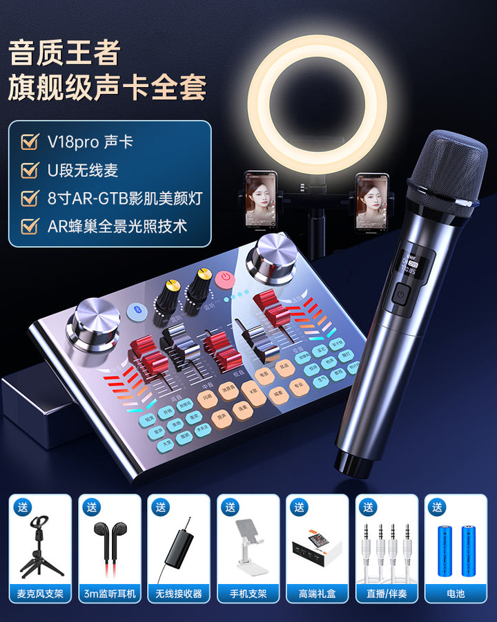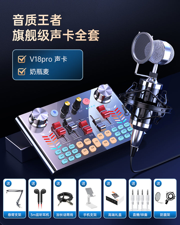 【入门版】V18声卡+线材包(不含话筒), 【旗舰版】V18声卡+手持麦全套, 【旗舰版】V18声卡+奶瓶麦全套, 【旗舰版】V18声卡+无线麦全套, 【旗舰版】V18声卡+振膜麦全套, 【网红套装】手持麦+美颜补光灯️声卡全套, 【网红套装】奶瓶麦+美颜补光灯声卡全套, 【网红套装】无线麦+美颜补光灯️声卡全套, 【网红套装】振膜麦+美颜补光灯声卡全套 |