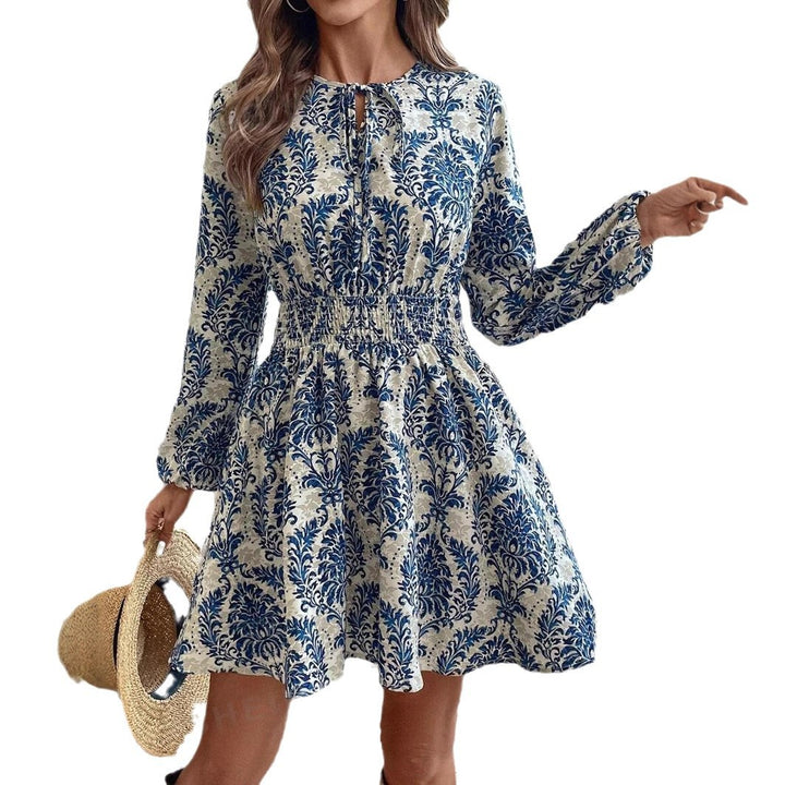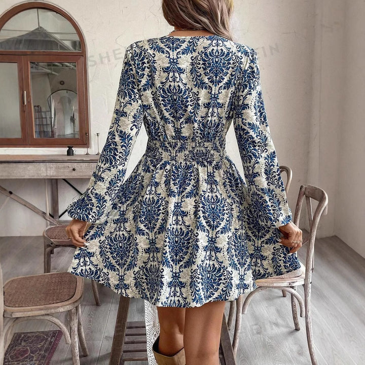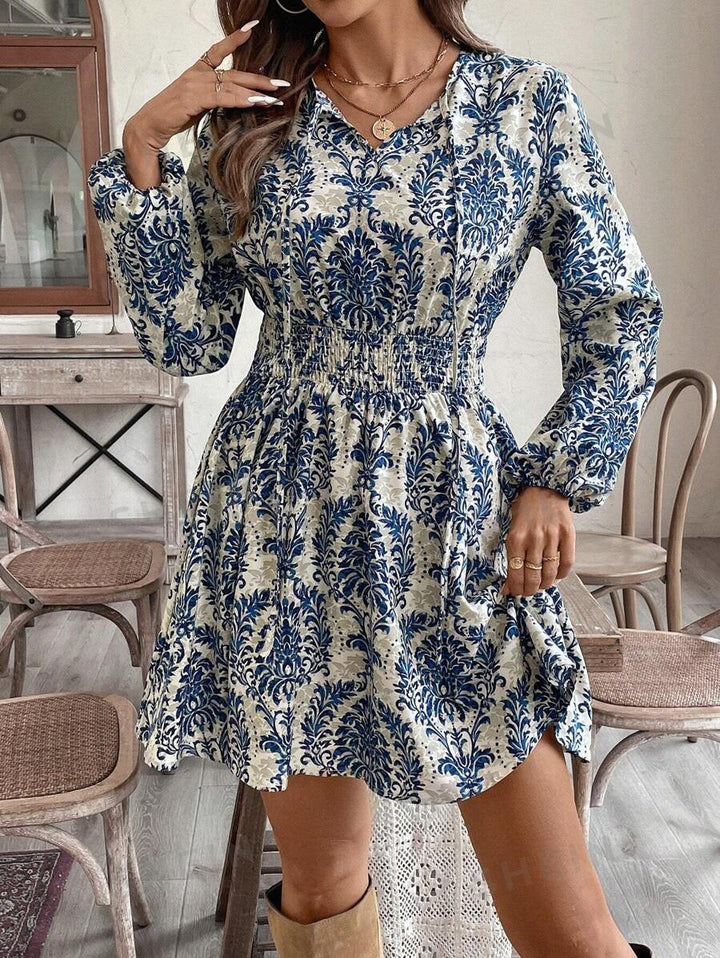 VCAY Women's Vacation Plant Print Neckline Lantern Sleeve Elegant Mini Dress, Autumn and Winter,