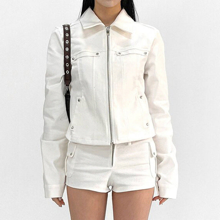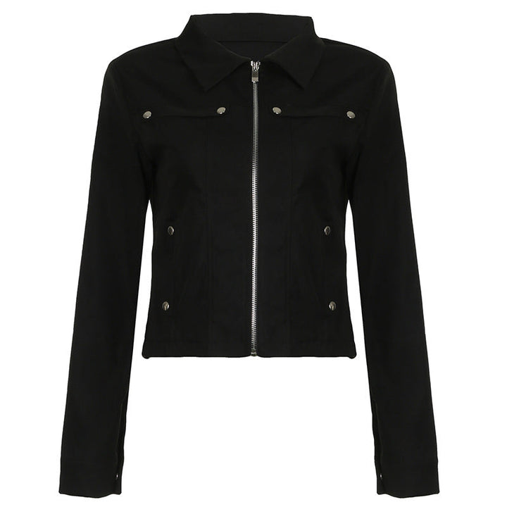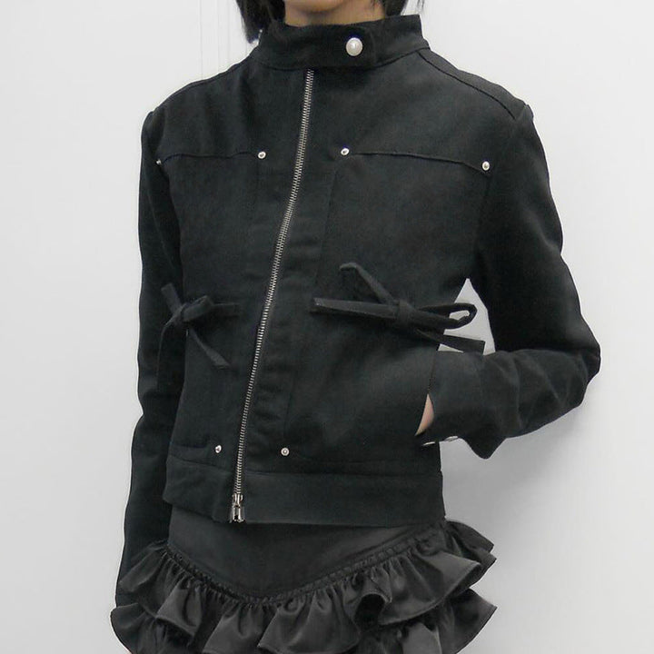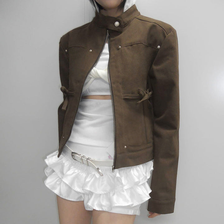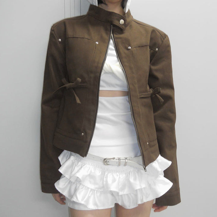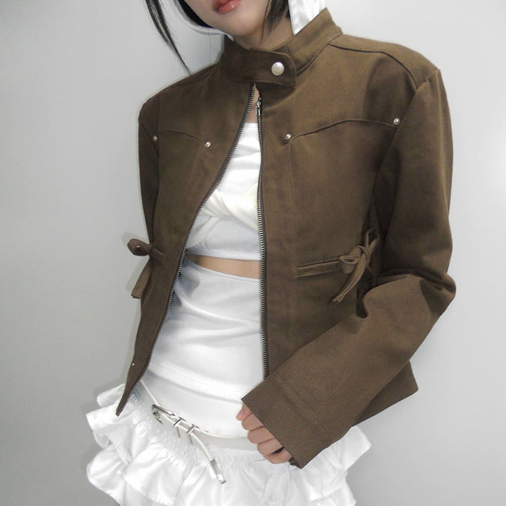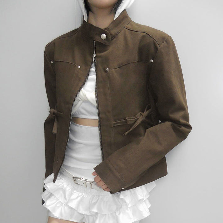 Vintage American street style women's stand-up collar jacket silhouette bow tooling pocket top autumn and winter slim jacket