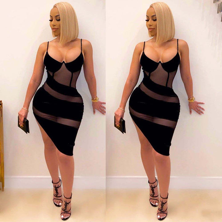 VK2087 sexy European and American V-neck, suspender, mesh perspective, chest-wrapped hip skirt nightclub skirt