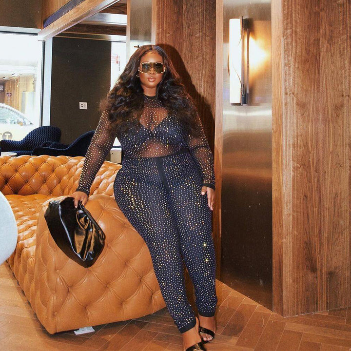 VK2247 European and American bright diamond long-sleeved large-size hot diamond jumpsuit