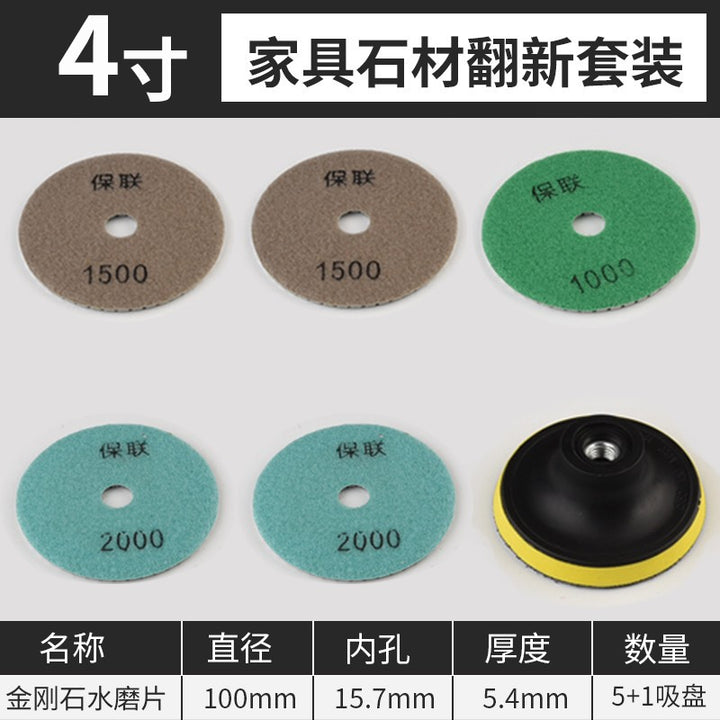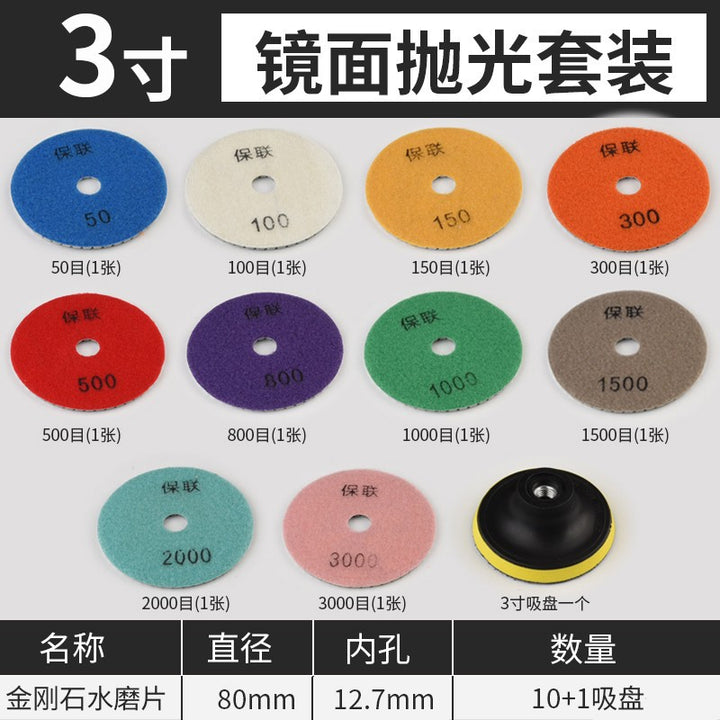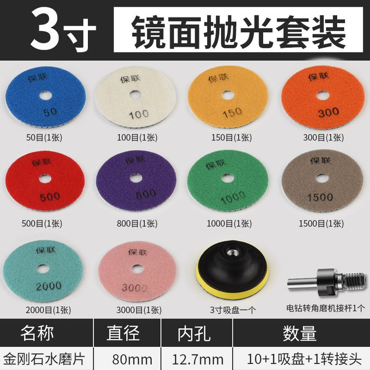 Flat decontamination set, Furniture stone renovation set, 3 inch 50 mesh 1 piece, 3 inch 100 mesh 1 piece, 3 inch 150 mesh 1 piece, 3 inch 300 mesh 1 piece, 3 inch 500 mesh 1 piece, 3 inch 800 mesh 1 piece, 3 inch 1000 mesh 1 piece, 3 inch 1500 mesh 1 piece, 3寸2000目 1片, 3寸3000目 1片, 3寸镜面打磨抛光套装, 3寸电钻用打磨抛光套装, 4寸50目 1片, 4寸100目 1片, 4寸150目 1片, 4寸300目 1片, 4寸500目 1片, 4寸800目 1片, 4 inch 1000 mesh 1 piece, 4 inch 1500 mesh 1 piece, 4 inch 2000 mesh 1 piece, 4 inch 3000 mesh 1 piece, 4 inch mirror polishing set, 4 inch electric drill grinding and polishing set |