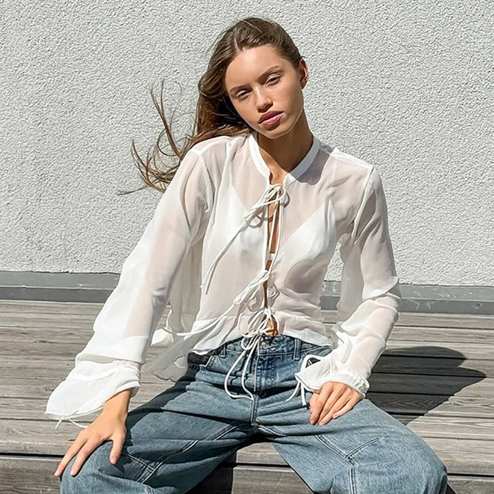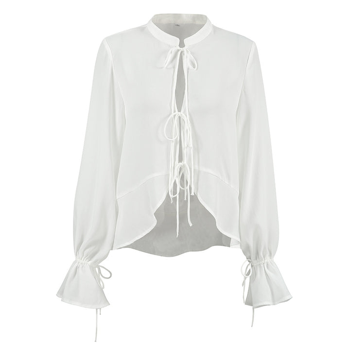 white lace-up shirt 2024 autumn European and American simple design sense loose stand-up coll...