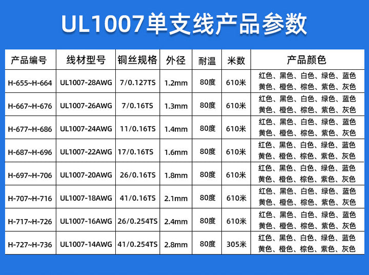 UL1007-28AWG Red, UL1007-28AWG black, UL1007-28AWG White, UL1007-28AWG green, UL1007-28AWG blue, UL1007-28AWG yellow, UL1007-28AWG Orange, UL1007-28AWG Brown, UL1007-28AWG purple, UL1007-28AWG Grey, UL1007-26AWG Red, UL1007-26AWG black, UL1007-26AWG White, UL1007-26AWG green, UL1007-26AWG blue, UL1007-26AWG yellow, UL1007-26AWG Orange, UL1007-26AWG Brown, UL1007-26AWG purple, UL1007-26AWG grey, UL1007-24AWG Red, UL1007-24AWG black, UL1007-24AWG White, UL1007-24AWG green, UL1007-24AWG blue, UL1007-24AWG yellow, UL1007-24AWG Orange, UL1007-24AWG brown, UL1007-24AWG purple, UL1007-24AWG grey, UL1007-22AWG Red, UL1007-22AWG black, UL1007-22AWG White, UL1007-22AWG green, UL1007-22AWG blue, UL1007-22AWG yellow, UL1007-22AWG Orange, UL1007-22AWG Brown, UL1007-22AWG purple, UL1007-22AWG grey, UL1007-20AWG Red, UL1007-20AWG black, UL1007-20AWG White, UL1007-20AWG green, UL1007-20AWG blue, UL1007-20AWG yellow, UL1007-20AWG Orange, UL1007-20AWG Brown, UL1007-20AWG purple, UL1007-20AWG grey, UL1007-18AWG red, UL1007-18AWG black, UL1007-18AWG White, UL1007-18AWG green, UL1007-18AWG blue, UL1007-18AWG yellow, UL1007-18AWG Orange, UL1007-18AWG brown, UL1007-18AWG purple, UL1007-18AWG grey, UL1007-16AWG Red, UL1007-16AWG black, UL1007-16AWG White, UL1007-16AWG green, UL1007-16AWG blue, UL1007-16AWG yellow, UL1007-16AWG Orange, UL1007-16AWG Brown, UL1007-16AWG purple, UL1007-16AWG grey, UL1007-14AWG Red, UL1007-14AWG black, UL1007-14AWG White, UL1007-14AWG green, UL1007-14AWG blue, UL1007-14AWG yellow, UL1007-14AWG Orange, UL1007-14AWG Brown, UL1007-14AWG purple, UL1007-14AWG grey |