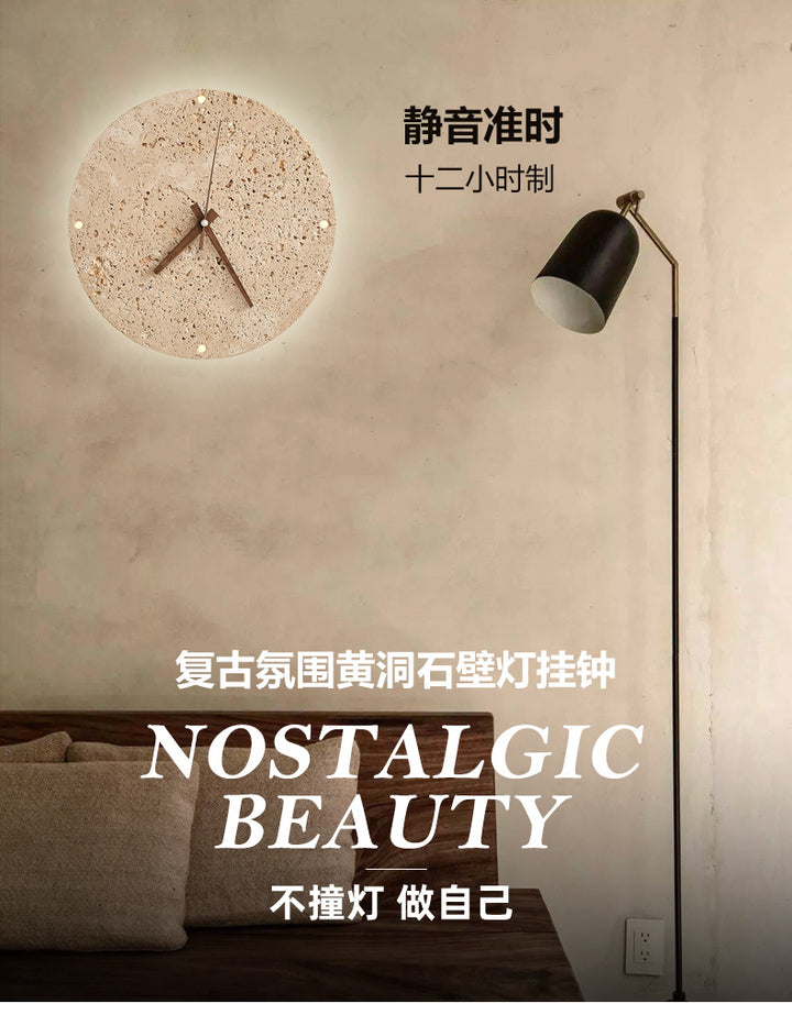 Wholesale clocks and watches Yellow travertine Bedroom bedside wall lamp Round clock Staircase Japanese-style wabi-sabi living room ambient light