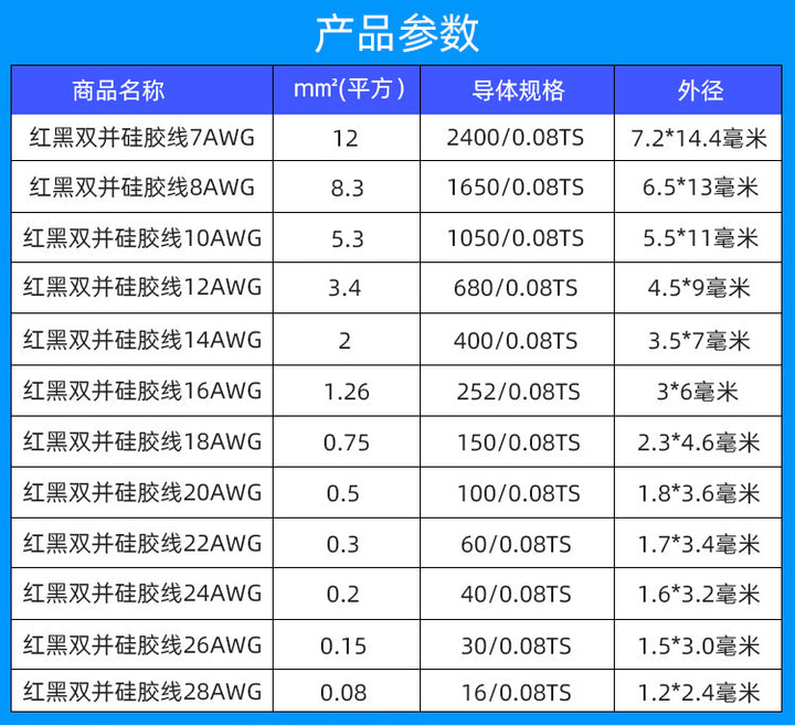28AWG red and black silicone parallel, 26AWG red and black silicone parallel, 24AWG red and black silicone parallel, 22AWG red and black silicone parallel, 20AWG red and black silicone parallel, 18AWG red and black silicone parallel, 16AWG red and black silicone parallel, 14AWG red and black silicone parallel, 12AWG red and black silicone parallel, 10AWG red and black silicone parallel, 8AWG red and black silicone parallel |