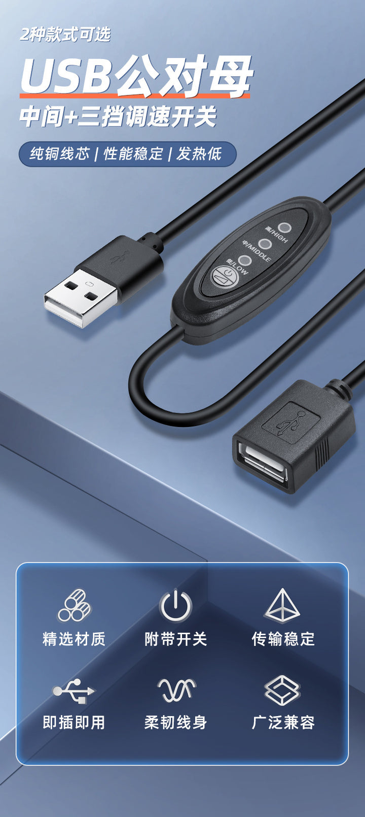 DC male to female + speed switch, USB male to female + speed switch |