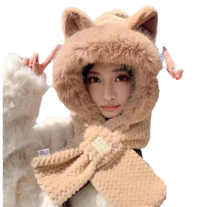 Winter new women's scarf integrated plush hat versatile cute rabbit fur hat cycling warm thickened scarf hooded