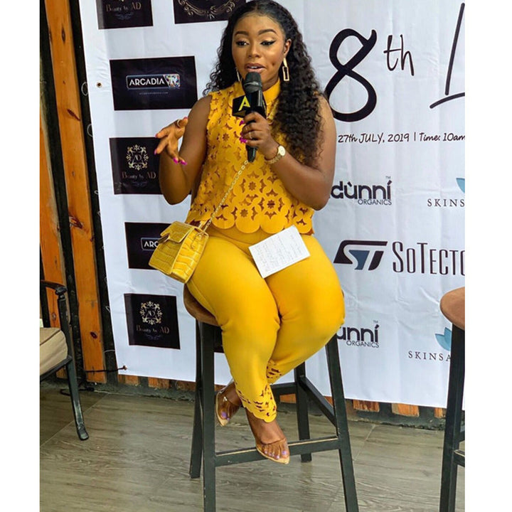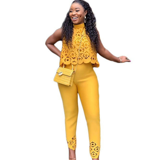 women's clothing 2024 new temperament sleeveless hollow top pants yellow set European and American two-piece set