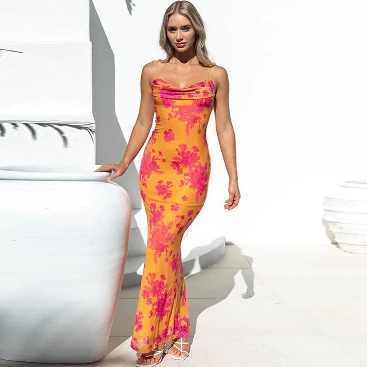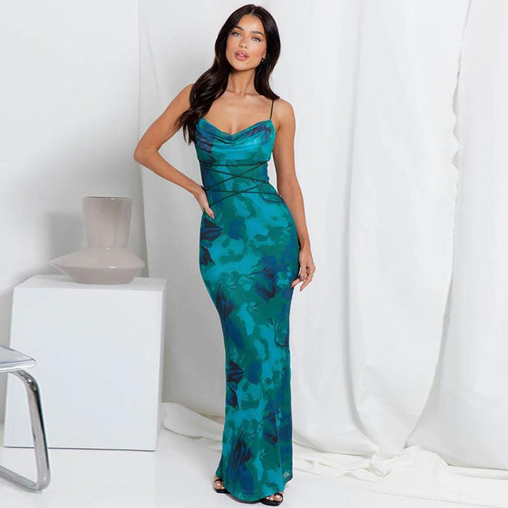 women's clothing 2024 spring and summer new sexy backless lace-up slim-fit printed suspender dress