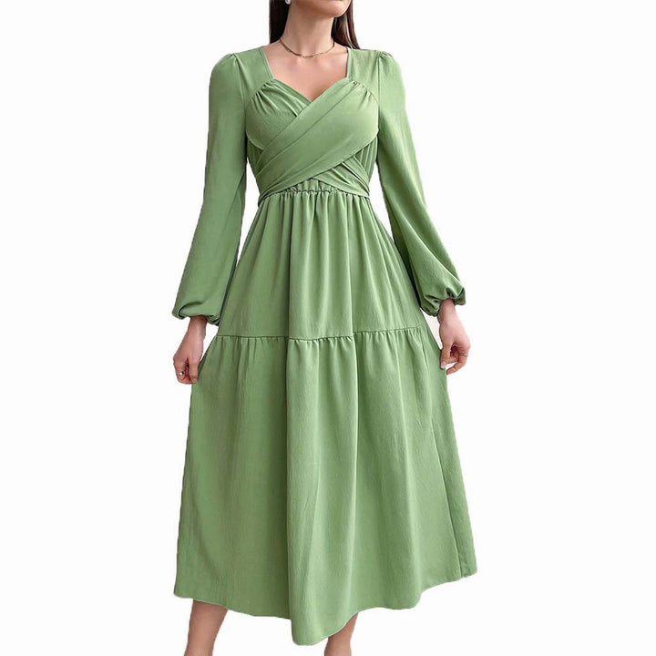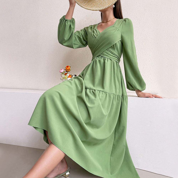 women's clothing elegant age-reducing dress autumn and winter small fresh and fashionable V-neck turquoise medium and long dress