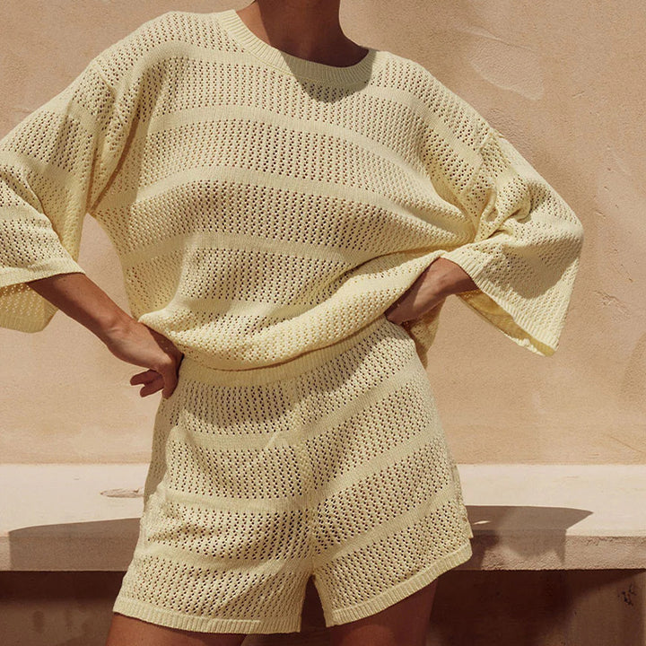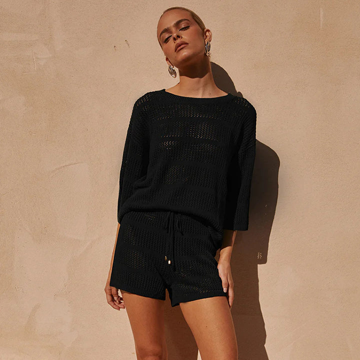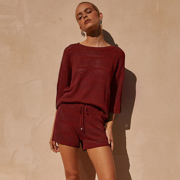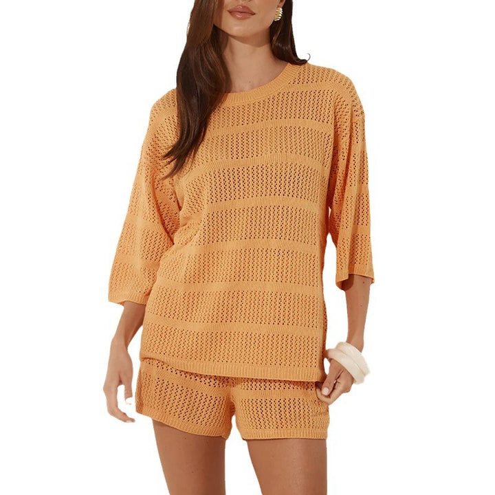 women's clothing fashion and leisure European and American suits solid color hollow short-sleeved sports shorts two-piece set