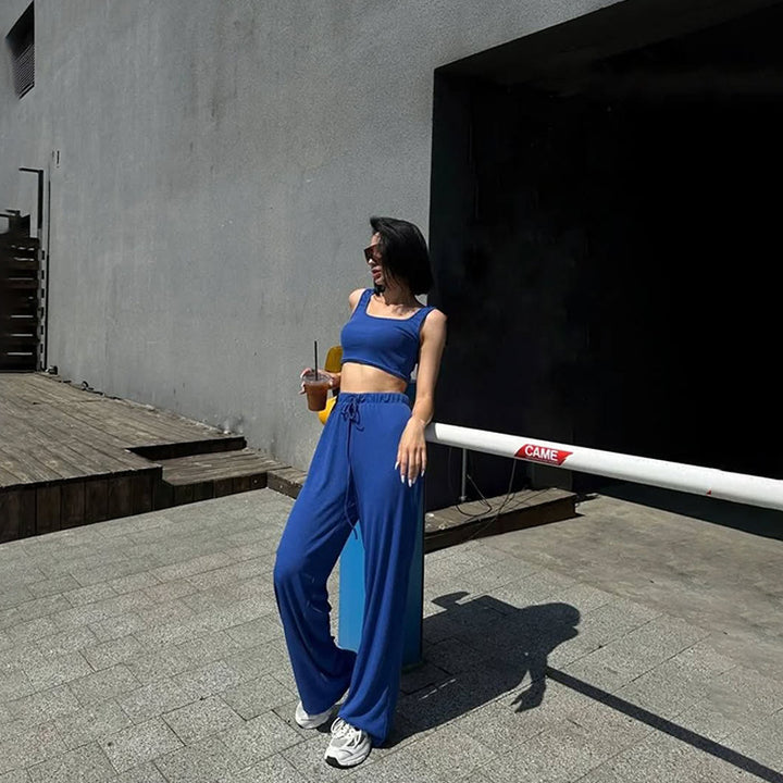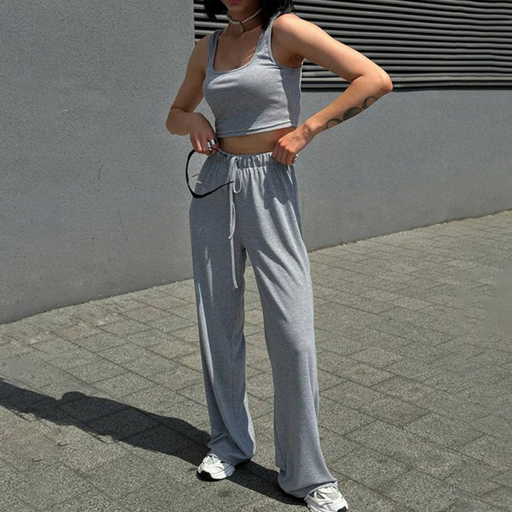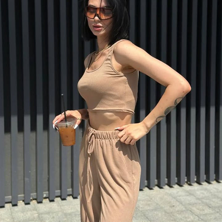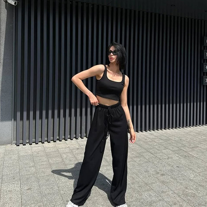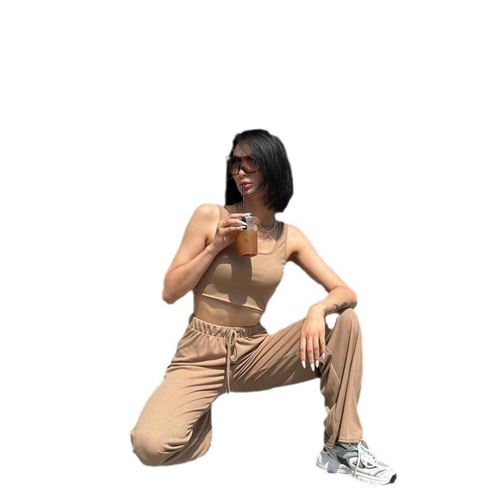 women's clothing, street style short vest, lace-up trousers, two-piece set, women's trousers, sports suit.