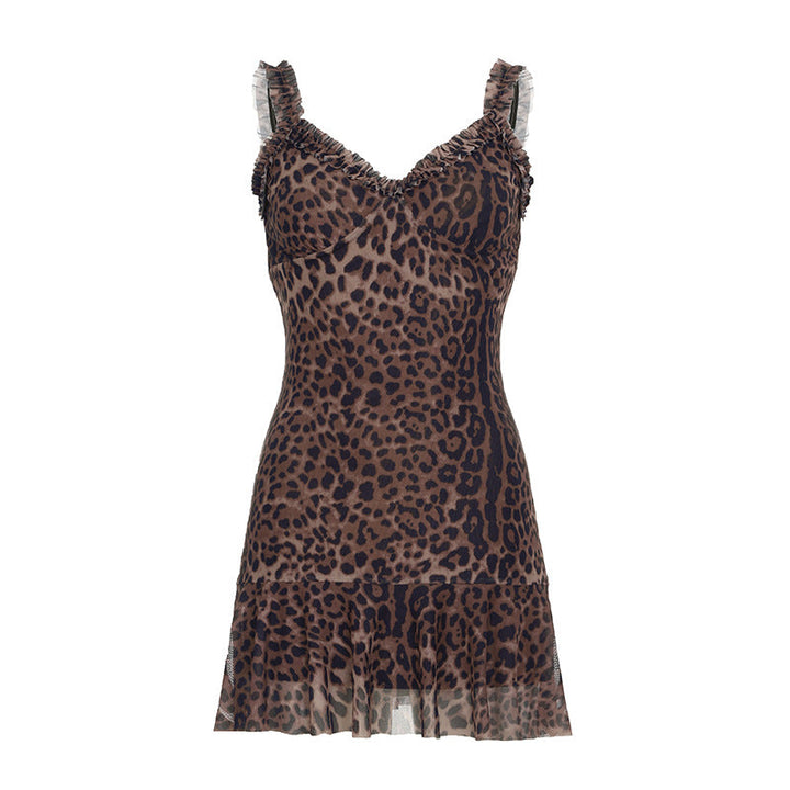 women's clothing summer mesh leopard print sexy V-neck waist ruffle edge suspender dress