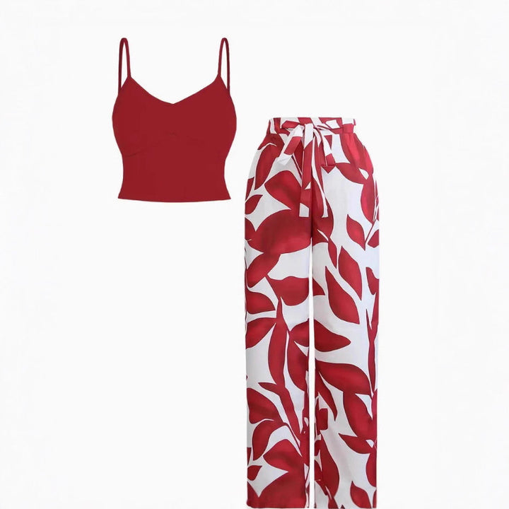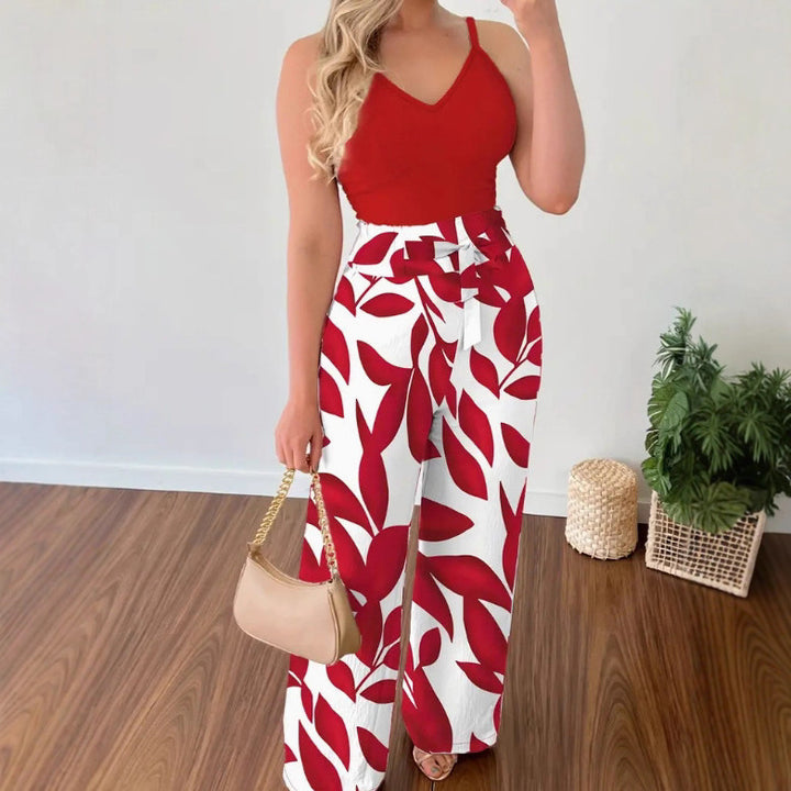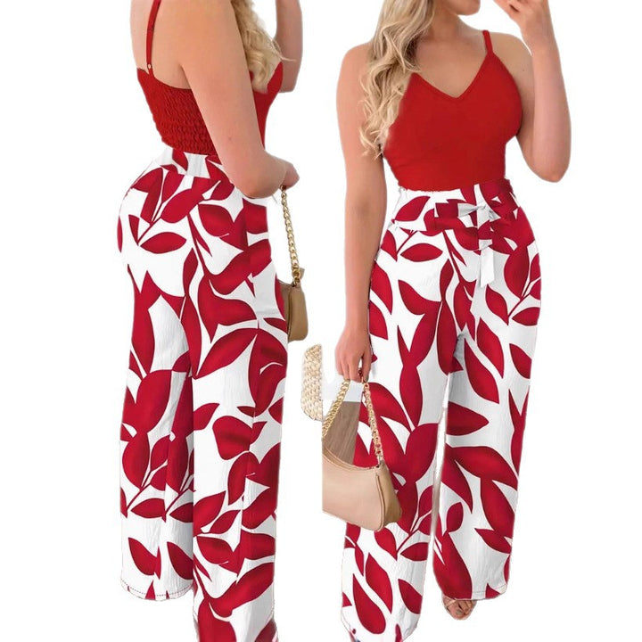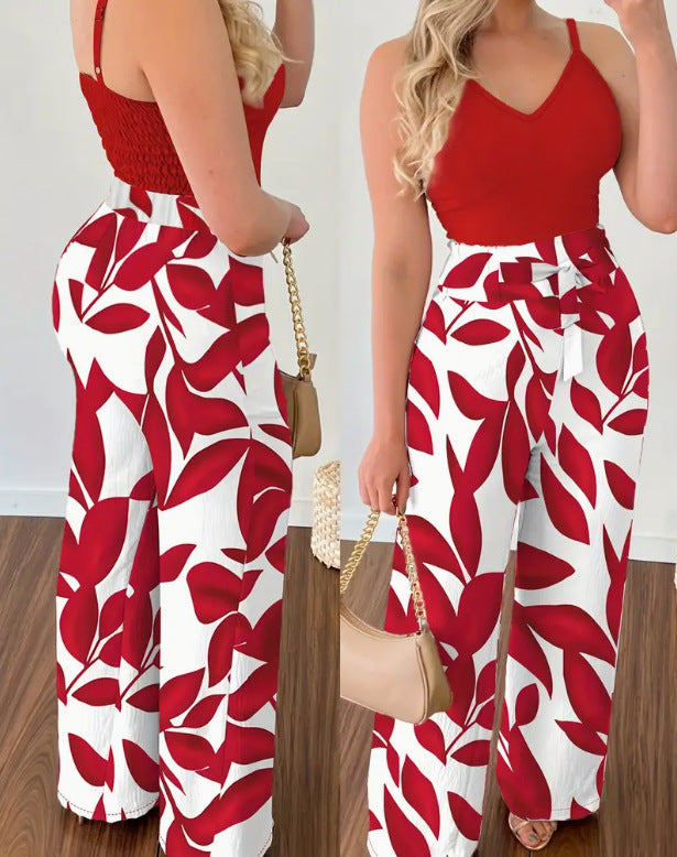 Women's elegant casual solid-color suspender top and plant-printed loose trousers two-piece set