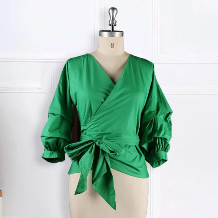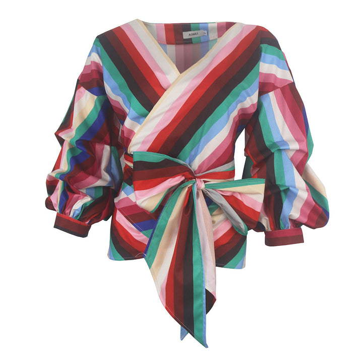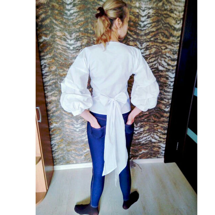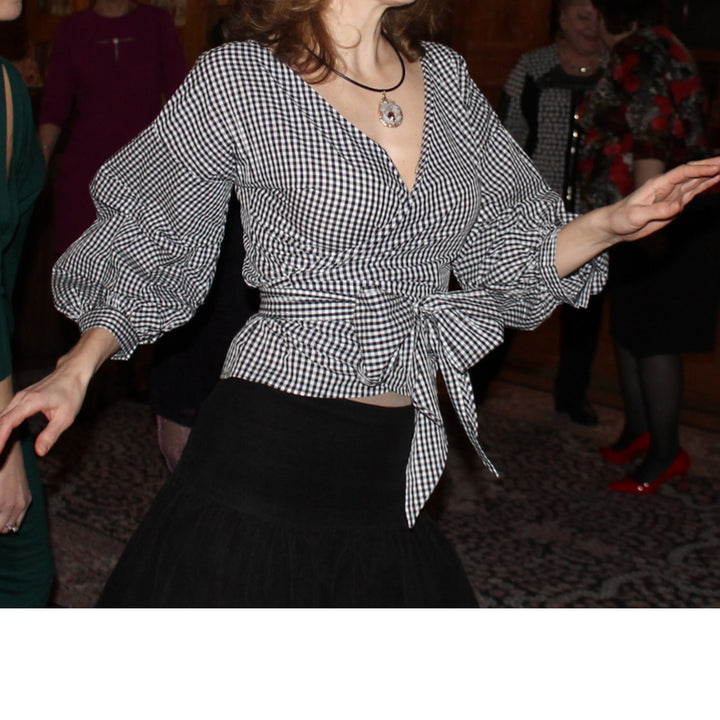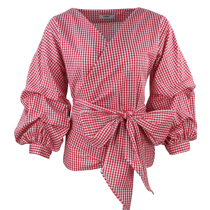 Women's Large Size Fashion V-Neck Off-Shoulder Large Bow Decorative Shirt Plaid Strap Top Tops
