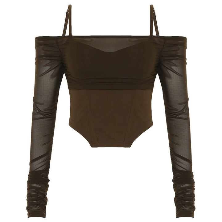 Women's Sexy Mesh Perspective One-Word Neck Suspender Long Sleeve Irregular Waist Slim Top T-Shirt Women