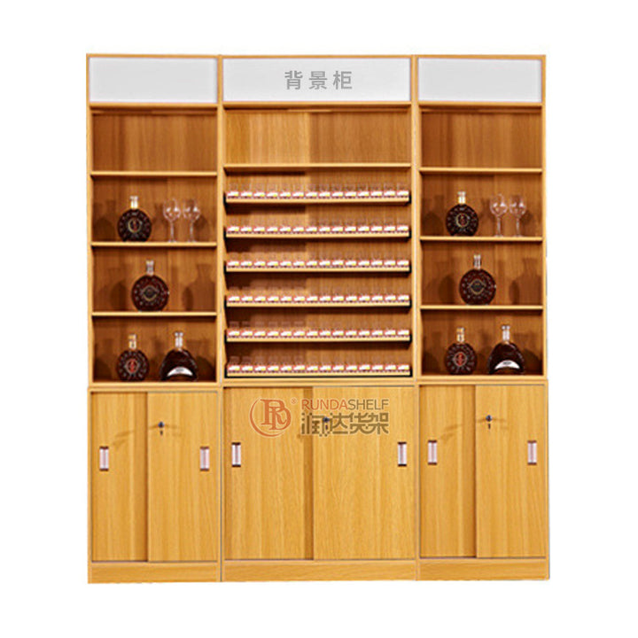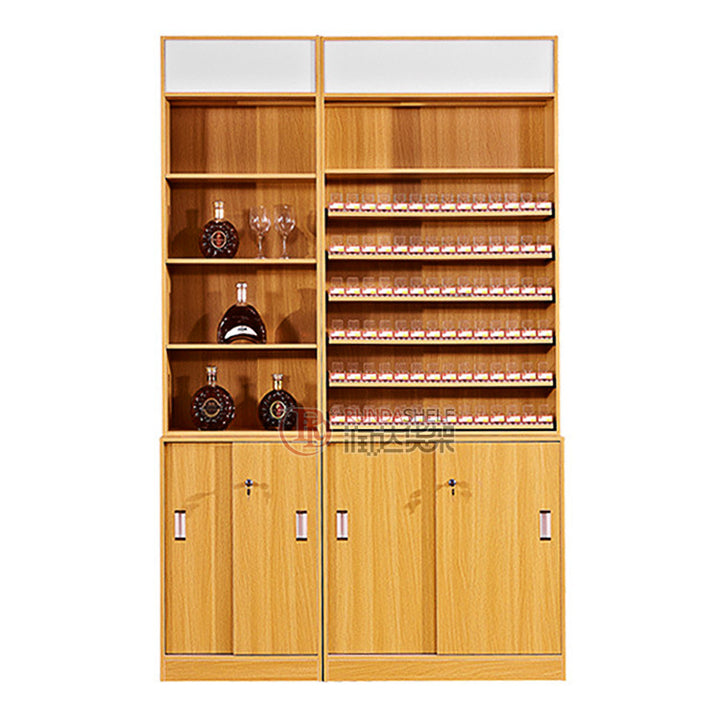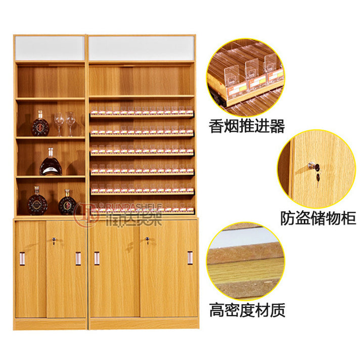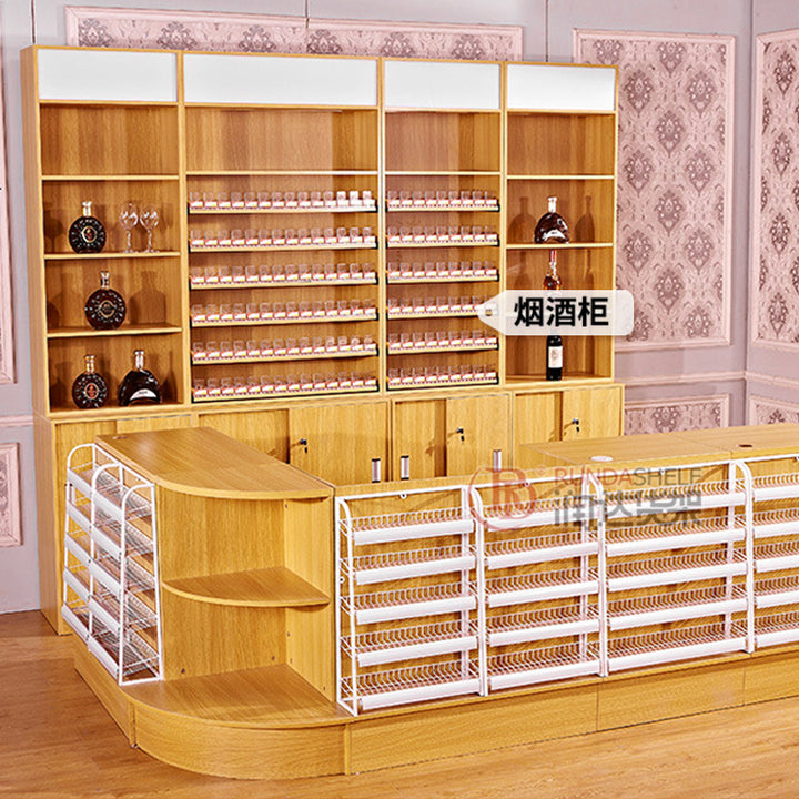 Wooden tobacco and wine cabinet, supermarket convenience store checkout page, supermarket con...
