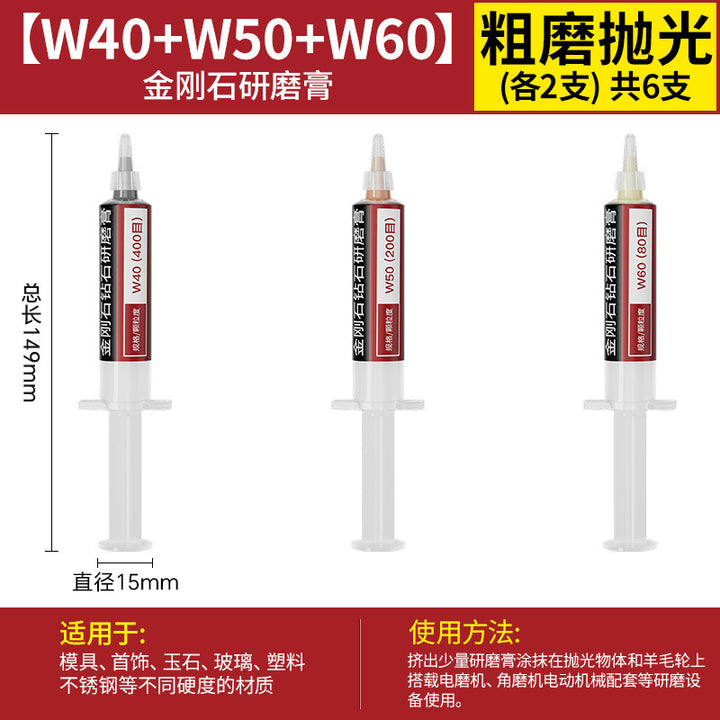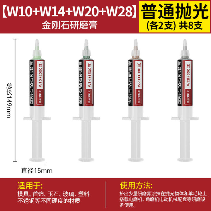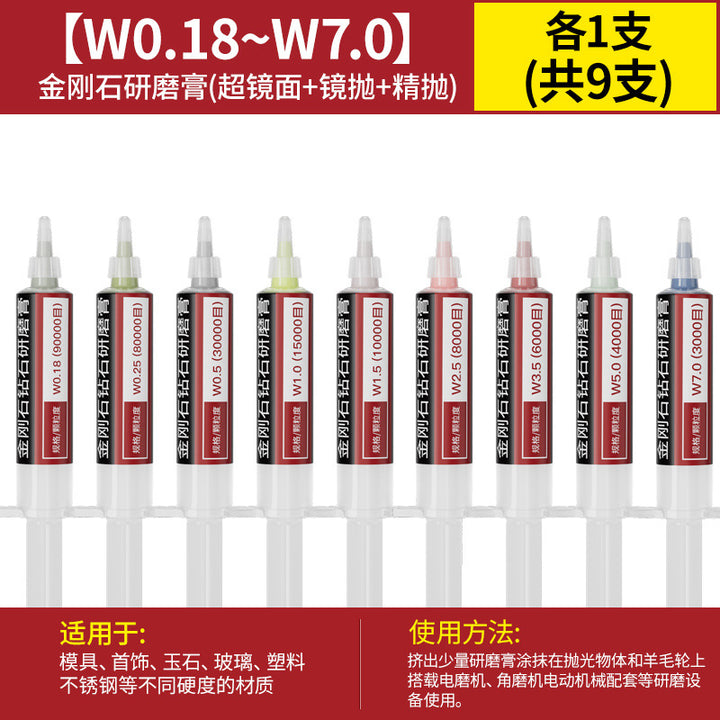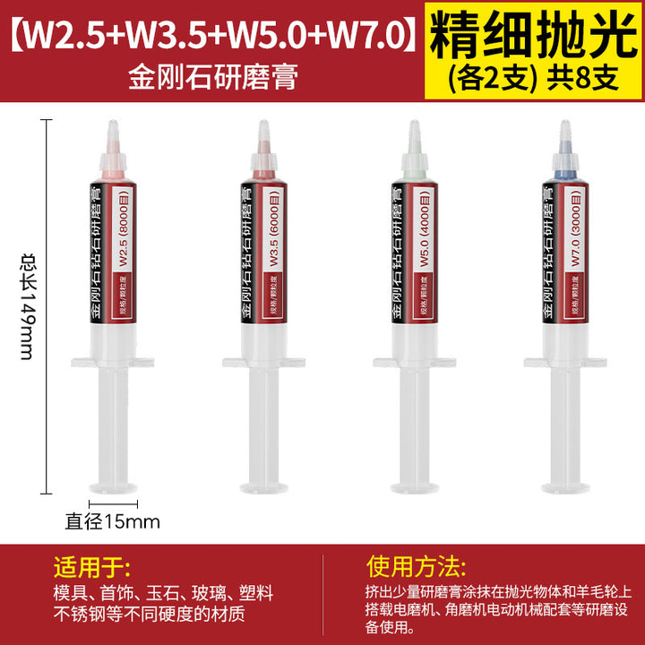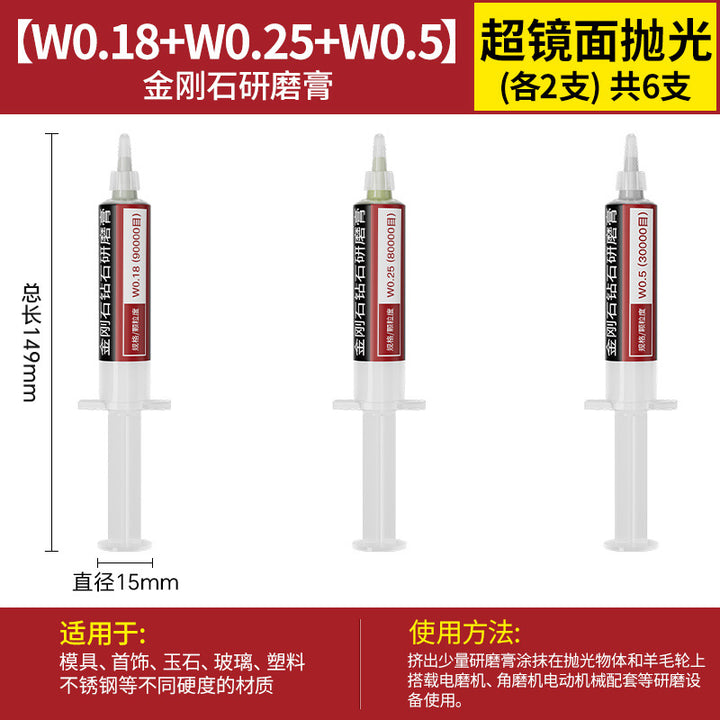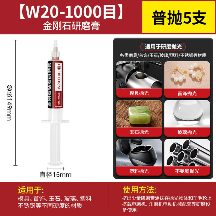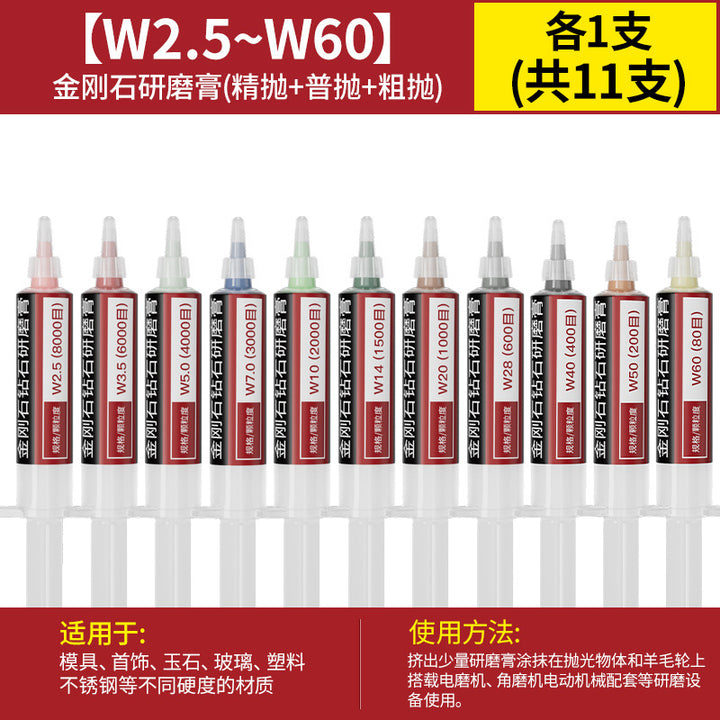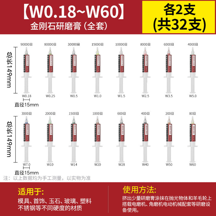 [cylindrical 3mm] 3.0 handle 10 pcs, [Cylinder 4mm] 3.0 handle 10 pcs, [cylindrical 5mm] 3.0 handle 10 pcs, [cylindrical 6mm] 3.0 handle 10 pcs, [cylindrical 8mm] 3.0 handle 10 pcs, [cylindrical 10mm] 3.0 handle 10 pcs, [Cylinder 12mm] 3.0 handle 10 pcs, [Cylinder 14mm] 3.0 handle 10 pcs, 【圆柱形16mm】3.0柄10支, 【圆柱形18mm】3.0柄10支, 【圆柱形20mm】3.0柄10支, 【11种圆柱形3-20mm各2个】共22支, 【圆锥形3mm】3.0柄10支, 【圆锥形4mm】3.0柄10支, 【圆锥形5mm】3.0柄10支, 【圆锥形6mm】3.0柄10支, [Conical 8mm] 3.0 shank 10 pcs, [Conical 10mm] 3.0 shank 10 pcs, [Conical 12mm] 3.0 shank 10 pcs, [Conical 14mm] 3.0 shank 10 pcs, [Conical 16mm] 3.0 shank 10 pcs, [Conical 18mm] 3.0 shank 10 pcs, 【圆锥形20mm】3.0柄10支, 【11种圆锥形3-20mm各2个】共22支, 【W60-80目】粗抛5支-抛光膏, 【W50-200目】粗抛5支-抛光膏, 【W40-400目】粗抛5支-抛光膏, 【W28-600目】普抛5支-抛光膏, 【W20-1000目】普抛5支-抛光膏, 【W14-1500目】普抛5支-抛光膏, [W10-2000 mesh] 5 pcs for general throwing - polishing paste, [W7.0-3000 mesh] 5 pcs fine polishing - polishing paste, [W5.0-4000 mesh] 5 pcs fine polishing - polishing paste, [W3.5-6000 mesh] 5 pcs fine polishing - polishing paste, [W2.5-8000 mesh] 5 pcs fine polishing - polishing paste, [W1.5-10000 mesh] 5 pcs mirror polishing paste, [W1.0-15000 mesh] 5 pcs mirror polishing paste, [W0.5-30000 mesh] Super mirror 5 pcs - polishing paste, [W0.25-80000 mesh] Super mirror 5 pcs - polishing paste, [W0.18-90000 mesh] Super mirror 5 pcs - polishing paste, 粗磨抛光【W60+W50+W40各2支】共6支-抛光膏, 普通抛光【W28+W20+W14+W10各2支】共8支-抛光膏, 精细抛光【W7.0+W5.0+W3.5+W2.5各2支】共8支-抛光膏, 镜面抛光【W1.5+W1.0+W0.5各2支】共6支-抛光膏, 超镜面抛光【W0.5+0.25+W0.18各2支】共6支-抛光膏, (粗抛+普抛+精抛)【11种W60-W2.5各1个】共11支-抛光膏, (Fine polishing + mirror polishing + super mirror surface) [1 each of 9 kinds of W7.0-W0.18] A total of 9 pcs - polishing paste, [2 of each of 16 kinds in a full set] A total of 32 pcs - polishing paste |