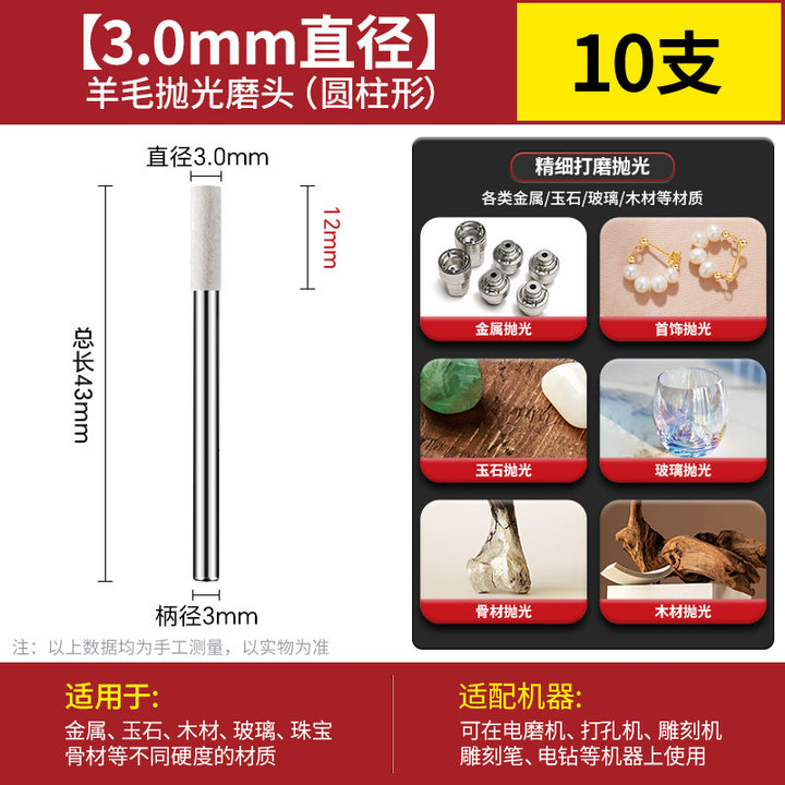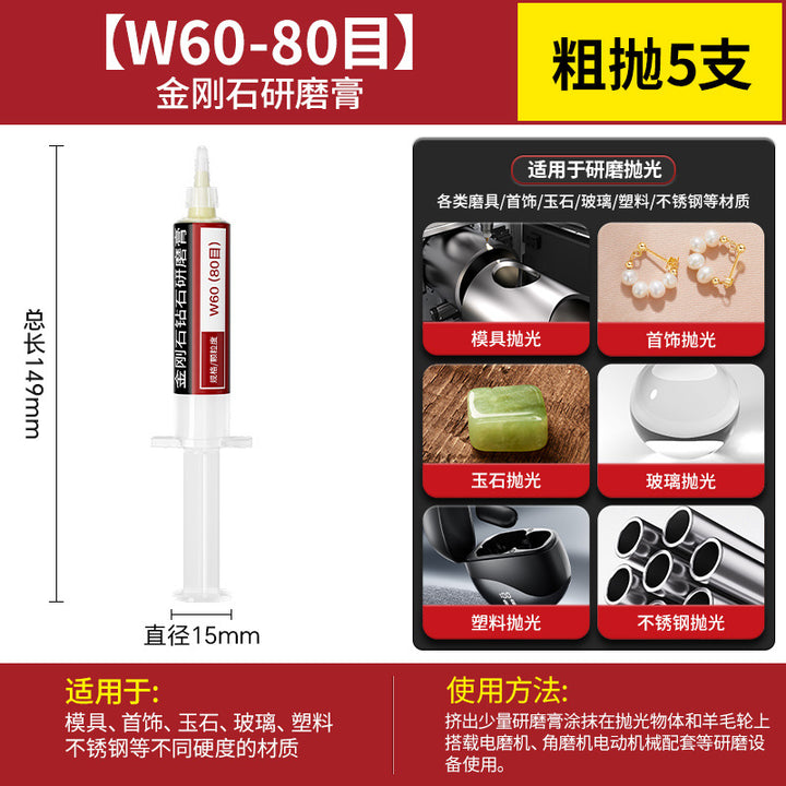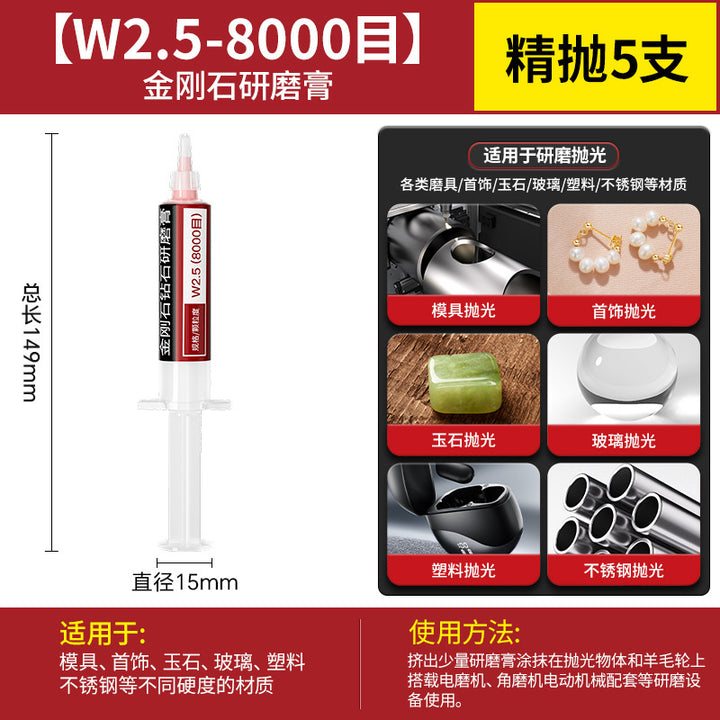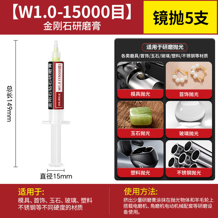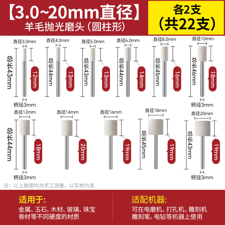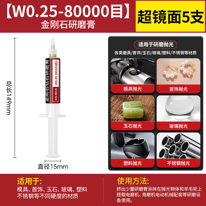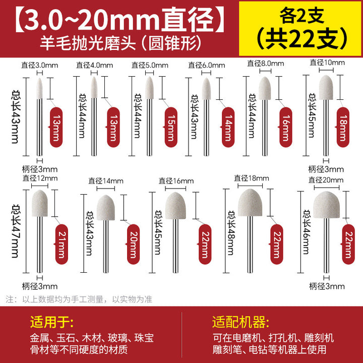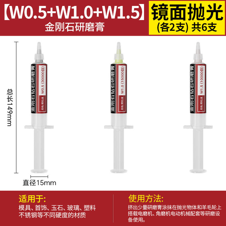 [cylindrical 3mm] 3.0 handle 10 pcs, [Cylinder 4mm] 3.0 handle 10 pcs, [cylindrical 5mm] 3.0 handle 10 pcs, [cylindrical 6mm] 3.0 handle 10 pcs, [cylindrical 8mm] 3.0 handle 10 pcs, [cylindrical 10mm] 3.0 handle 10 pcs, [Cylinder 12mm] 3.0 handle 10 pcs, [Cylinder 14mm] 3.0 handle 10 pcs, 【圆柱形16mm】3.0柄10支, 【圆柱形18mm】3.0柄10支, 【圆柱形20mm】3.0柄10支, 【11种圆柱形3-20mm各2个】共22支, 【圆锥形3mm】3.0柄10支, 【圆锥形4mm】3.0柄10支, 【圆锥形5mm】3.0柄10支, 【圆锥形6mm】3.0柄10支, [Conical 8mm] 3.0 shank 10 pcs, [Conical 10mm] 3.0 shank 10 pcs, [Conical 12mm] 3.0 shank 10 pcs, [Conical 14mm] 3.0 shank 10 pcs, [Conical 16mm] 3.0 shank 10 pcs, [Conical 18mm] 3.0 shank 10 pcs, 【圆锥形20mm】3.0柄10支, 【11种圆锥形3-20mm各2个】共22支, 【W60-80目】粗抛5支-抛光膏, 【W50-200目】粗抛5支-抛光膏, 【W40-400目】粗抛5支-抛光膏, 【W28-600目】普抛5支-抛光膏, 【W20-1000目】普抛5支-抛光膏, 【W14-1500目】普抛5支-抛光膏, [W10-2000 mesh] 5 pcs for general throwing - polishing paste, [W7.0-3000 mesh] 5 pcs fine polishing - polishing paste, [W5.0-4000 mesh] 5 pcs fine polishing - polishing paste, [W3.5-6000 mesh] 5 pcs fine polishing - polishing paste, [W2.5-8000 mesh] 5 pcs fine polishing - polishing paste, [W1.5-10000 mesh] 5 pcs mirror polishing paste, [W1.0-15000 mesh] 5 pcs mirror polishing paste, [W0.5-30000 mesh] Super mirror 5 pcs - polishing paste, [W0.25-80000 mesh] Super mirror 5 pcs - polishing paste, [W0.18-90000 mesh] Super mirror 5 pcs - polishing paste, 粗磨抛光【W60+W50+W40各2支】共6支-抛光膏, 普通抛光【W28+W20+W14+W10各2支】共8支-抛光膏, 精细抛光【W7.0+W5.0+W3.5+W2.5各2支】共8支-抛光膏, 镜面抛光【W1.5+W1.0+W0.5各2支】共6支-抛光膏, 超镜面抛光【W0.5+0.25+W0.18各2支】共6支-抛光膏, (粗抛+普抛+精抛)【11种W60-W2.5各1个】共11支-抛光膏, (Fine polishing + mirror polishing + super mirror surface) [1 each of 9 kinds of W7.0-W0.18] A total of 9 pcs - polishing paste, [2 of each of 16 kinds in a full set] A total of 32 pcs - polishing paste |