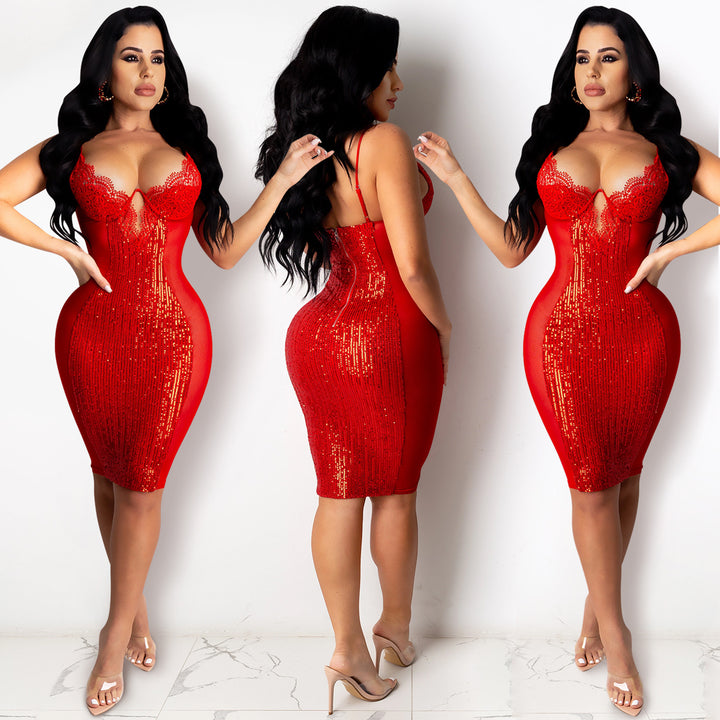 X3899 autumn and winter European and American new women's clothing nightclub sexy suspender dress sequined lace