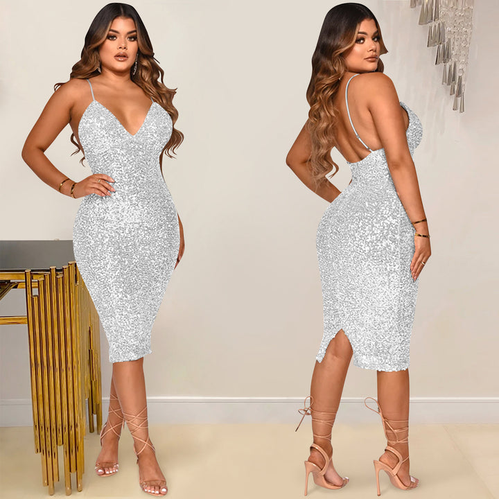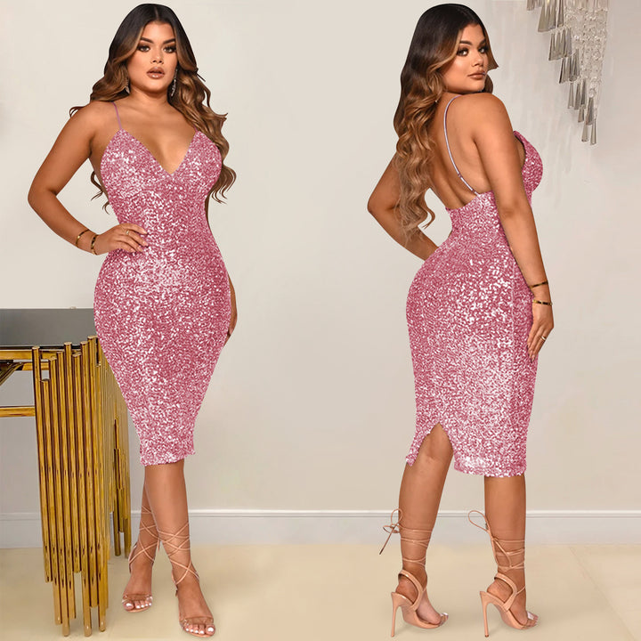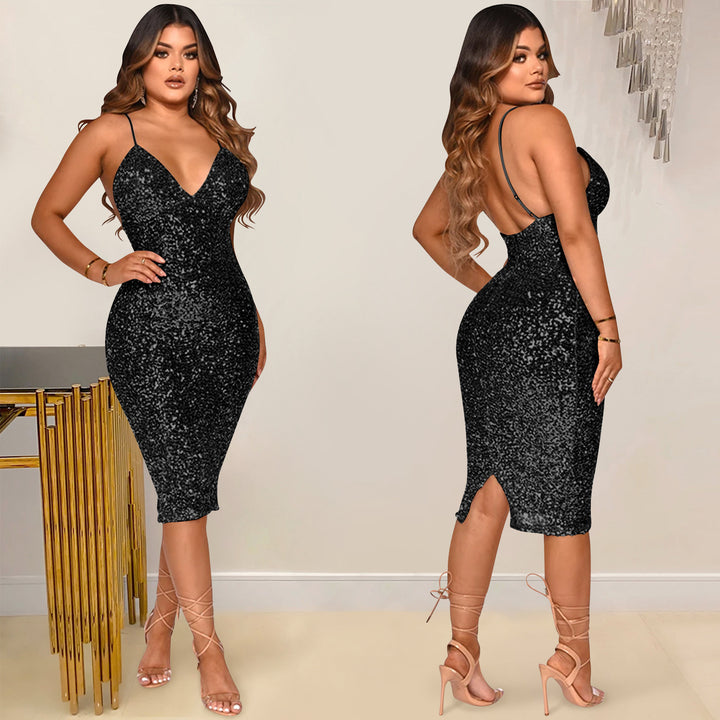 X5611 Cross-border European and American new products solid color sequins sexy suspender V-neck middle dress dress women