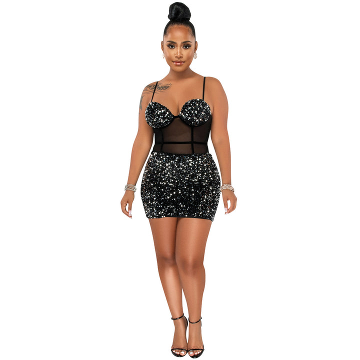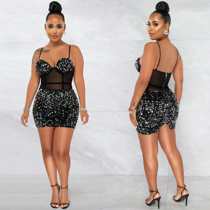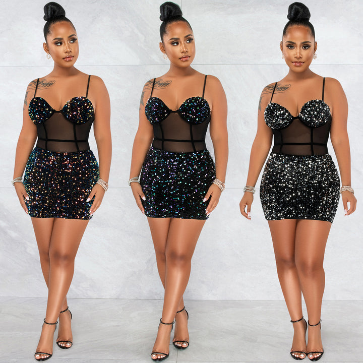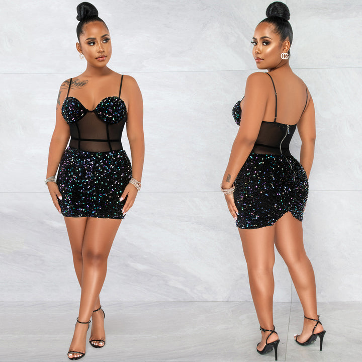 X5637 Cross-border Fashion Sexy Suspender Sequin Mesh Perspective Zipper Middress Dress