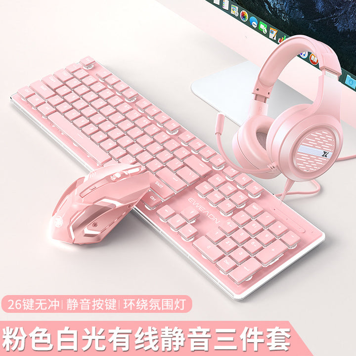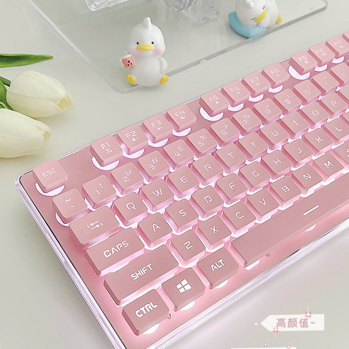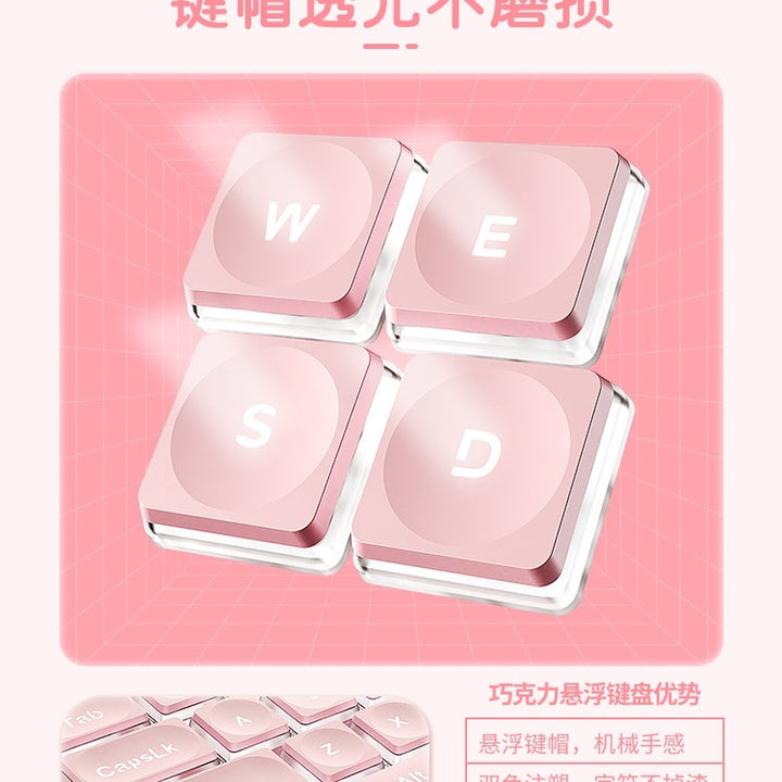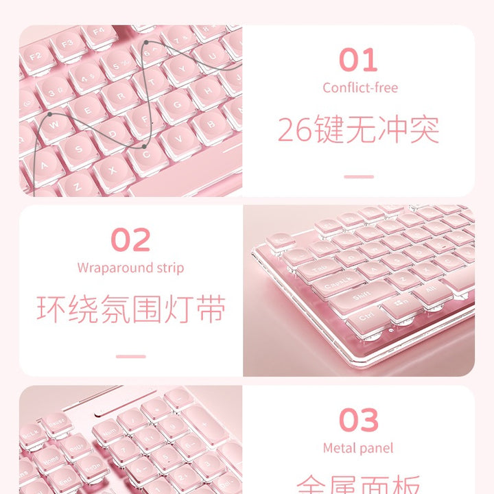Mechanical feel - wired model - pink white light [button mute], Mechanical feel - wired set - pink white light + mouse [button mute], Mechanical feel - wired three-piece package - pink white light + mouse + earphone [button mute], Mechanical feel - wireless version - pink white light [silent rechargeable], Mechanical feel - wireless set - pink white light + wireless mouse [silent rechargeable] |