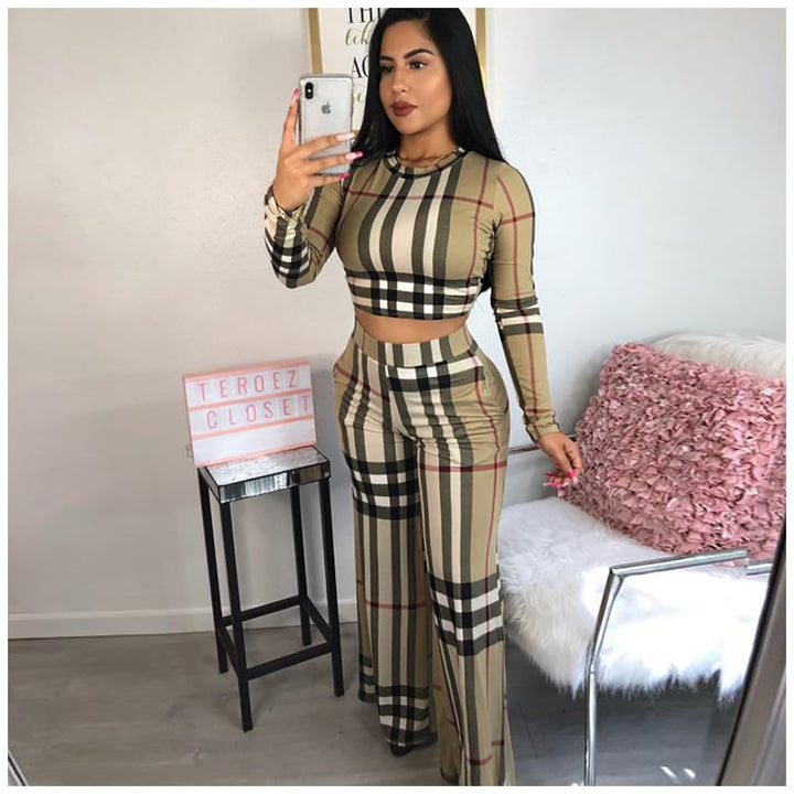 Y5057 wish European and American women's clothing wholesale personalized plaid printing casual two-piece set